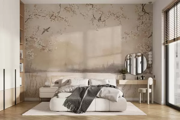 Fototapet Delikata blommande grenar vid sjön med fåglar i lätt dimma Nr. w05155