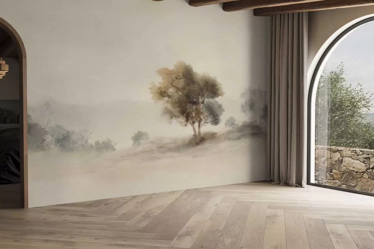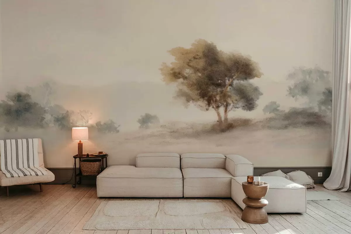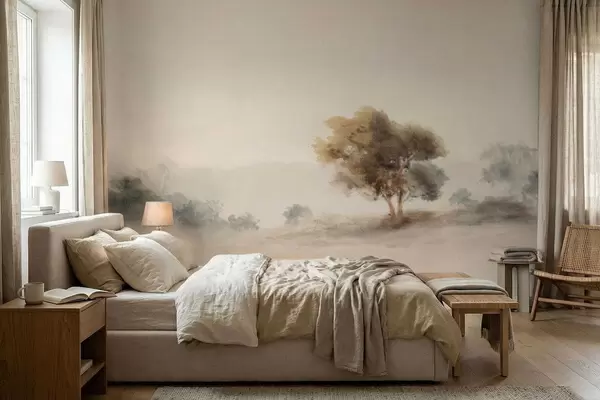 Fototapet Minimalistiskt landskap med ett ensamt träd i dimman Nr. w05223