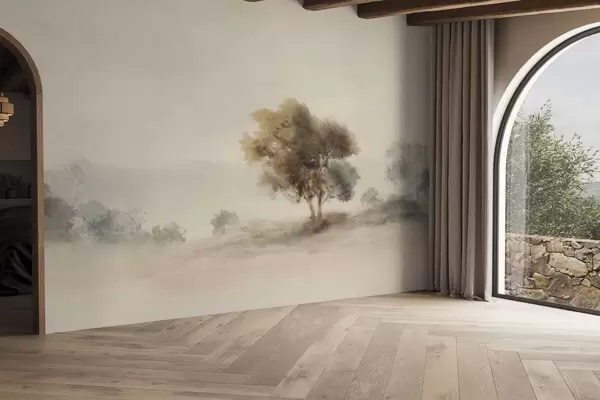 Fototapet Minimalistiskt landskap med ett ensamt träd i dimman Nr. w05223