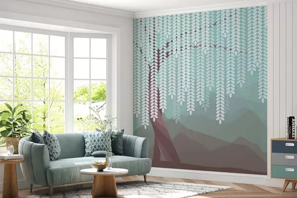 Fototapet stiliserad pil med hängande löv mot en bakgrund av minimalistiska berg i nyanser av choklad och turkos Nr. w05232v1