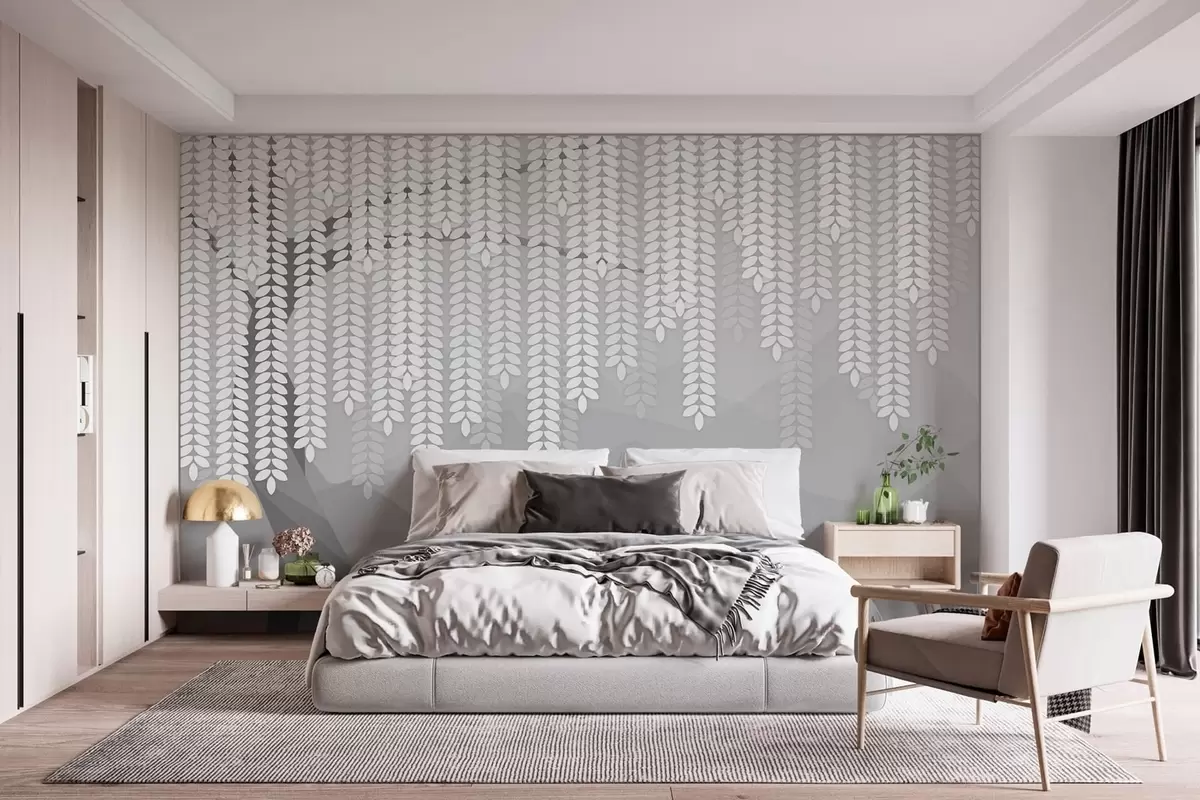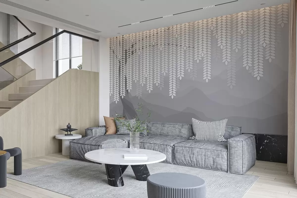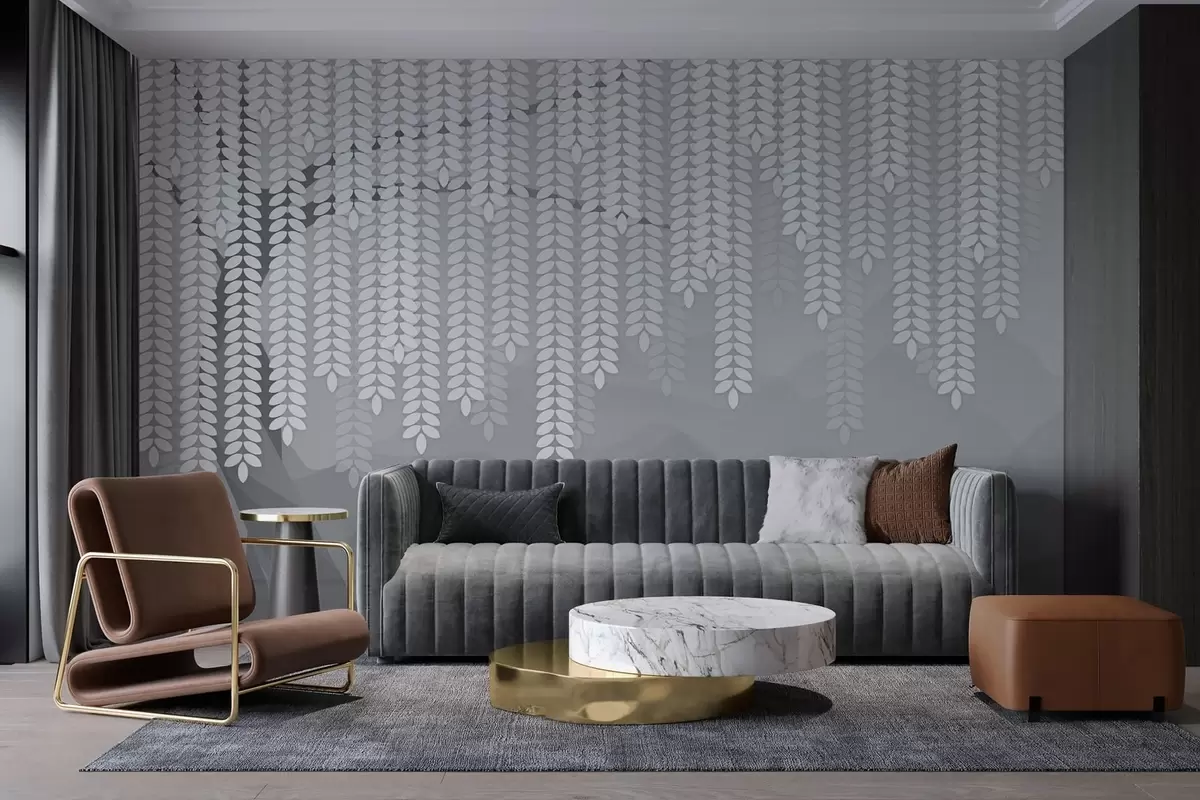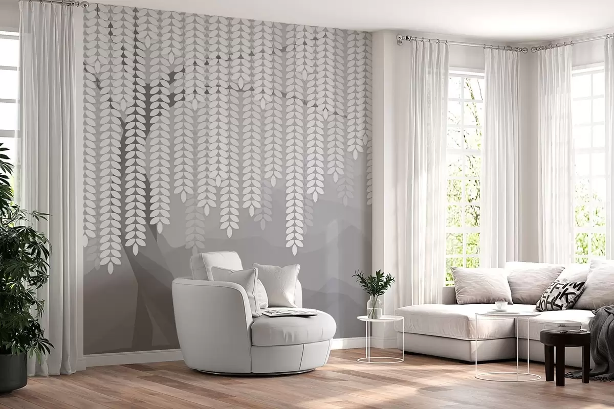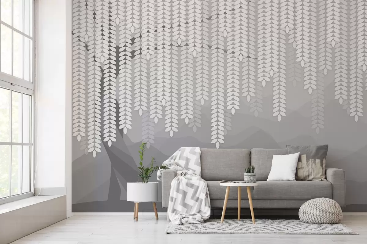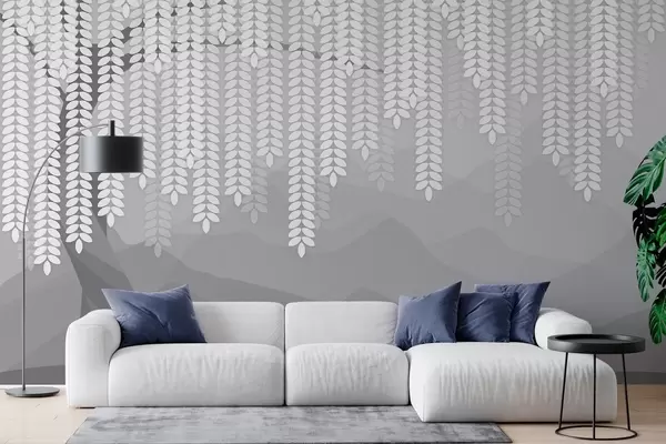 Fototapet stiliserad pil med hängande löv mot en bakgrund av minimalistiska berg i grå nyanser Nr. w05232v3