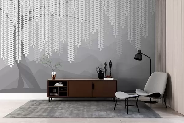 Fototapet stiliserad pil med hängande löv mot en bakgrund av minimalistiska berg i grå nyanser w05232v3