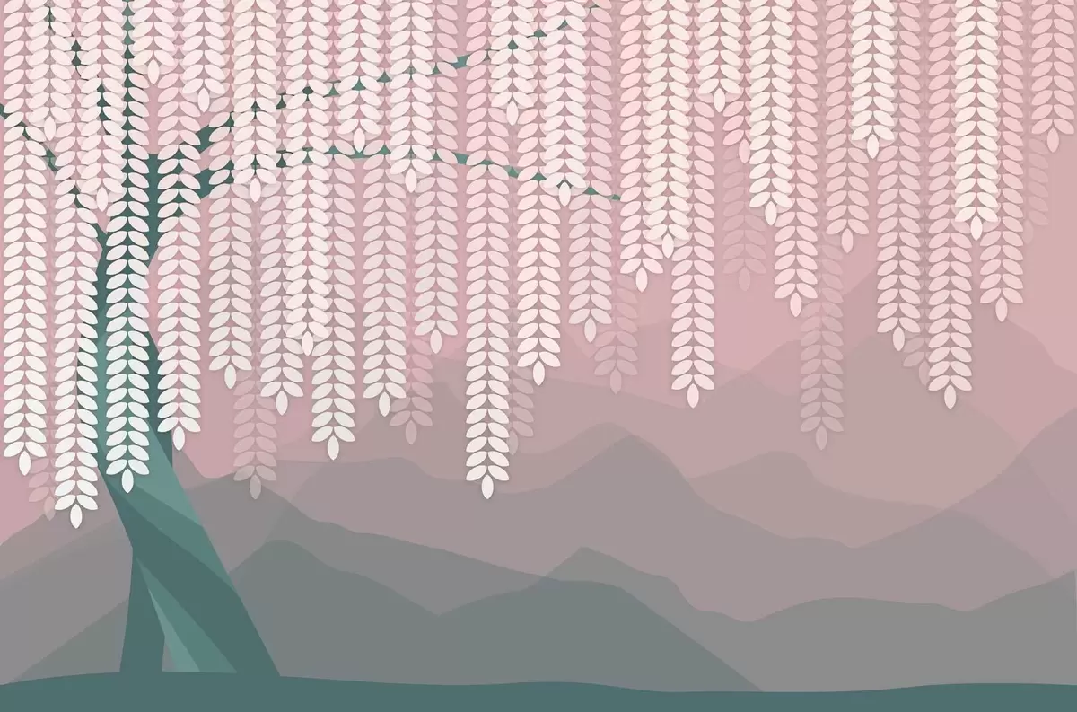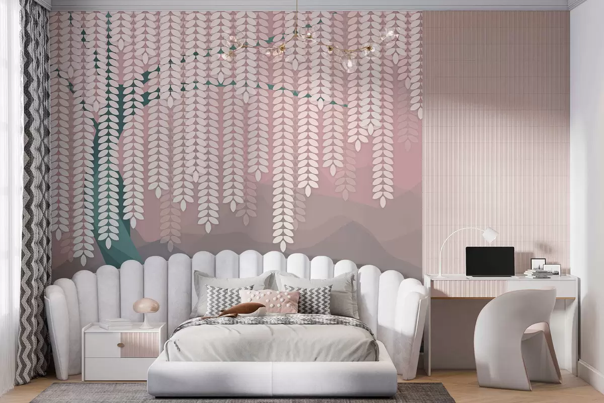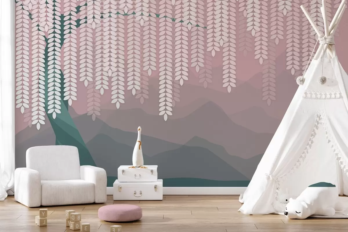 Fototapet Stiliserad pil med hängande löv mot en bakgrund av minimalistiska berg i nyanser av rosa och mörkgrönt. Nr. w05232v4
