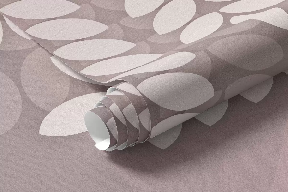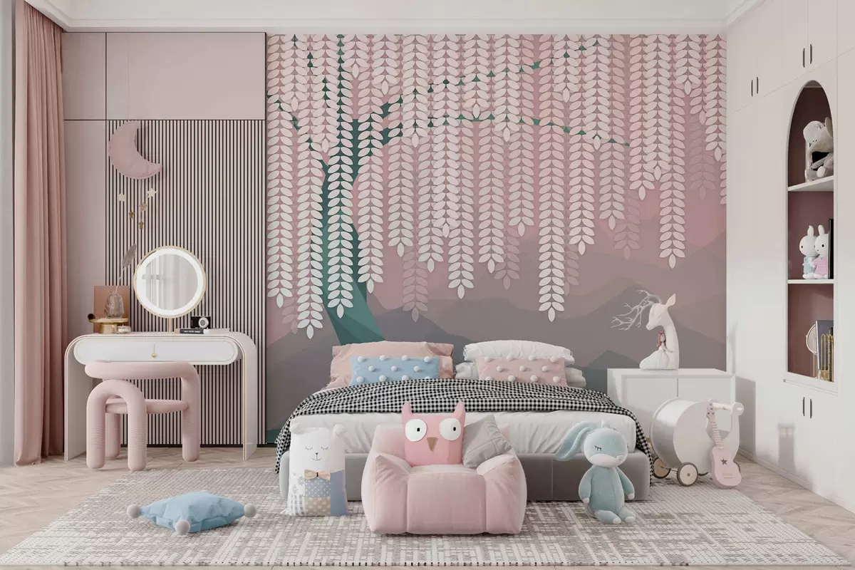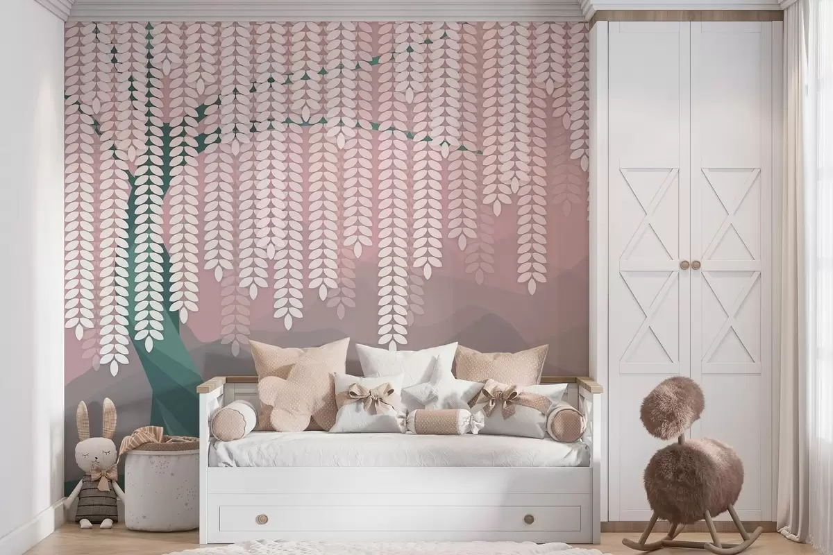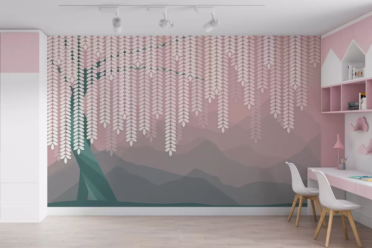 Fototapet Stiliserad pil med hängande löv mot en bakgrund av minimalistiska berg i nyanser av rosa och mörkgrönt. Nr. w05232v4