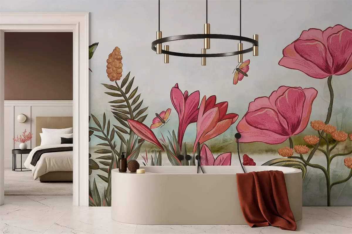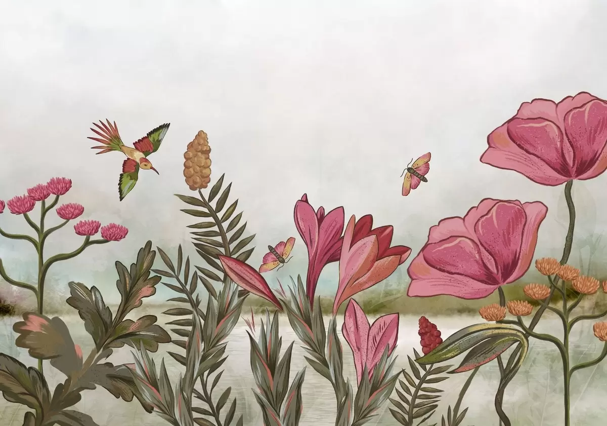 Fototapet Ljusa blommor med fåglar och fjärilar Nr. w05321