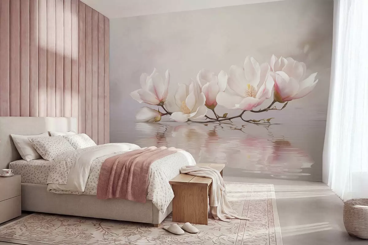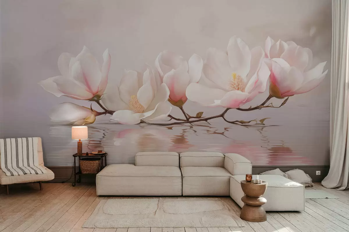 Fototapet Magnoliagren med blommor ovanför stilla vattenreflektion Nr. w05353v1