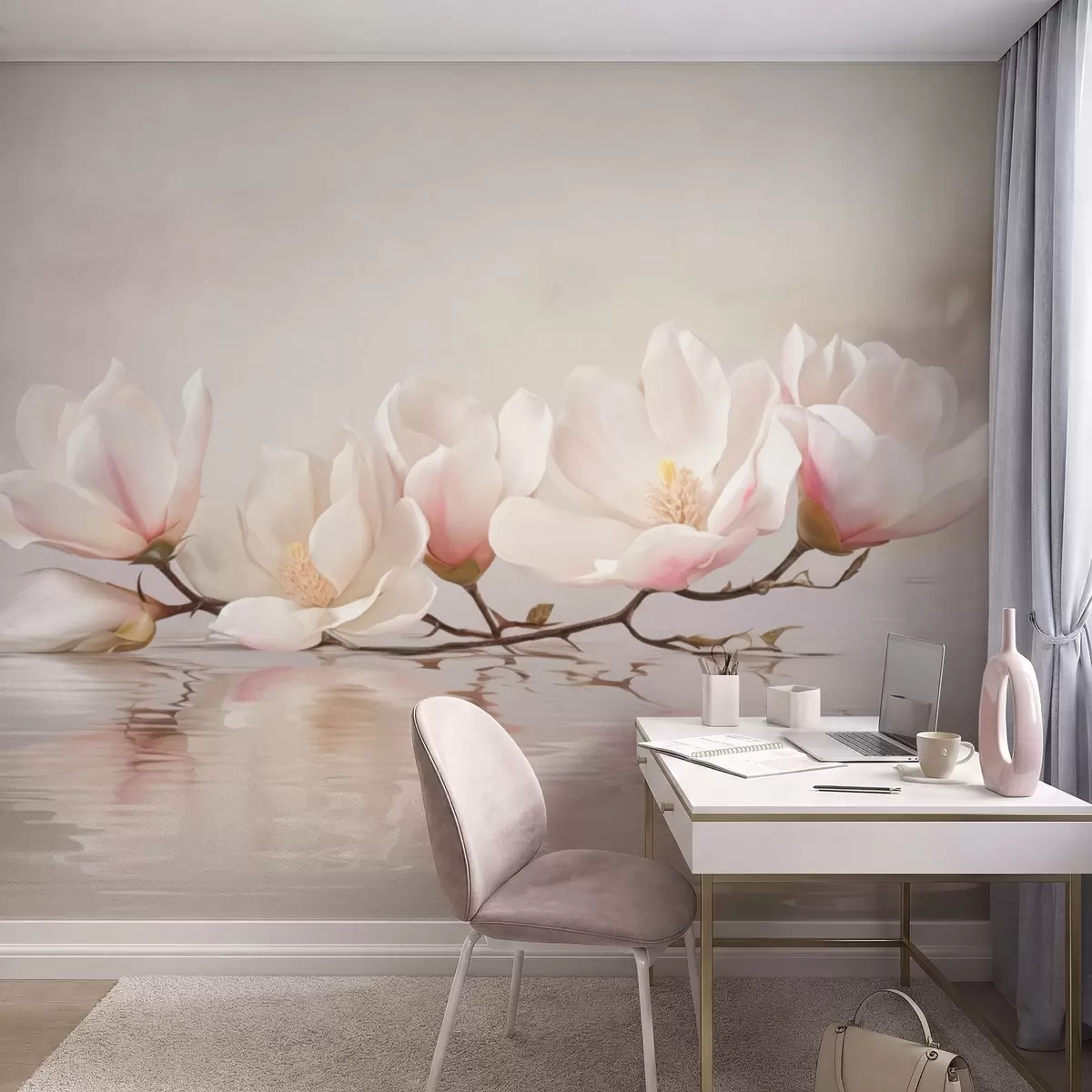 Fototapet Magnoliagren med blommor ovanför stilla vattenreflektion Nr. w05353v1