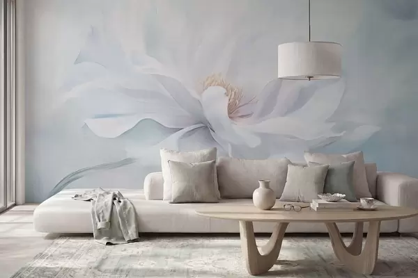 Fototapet Mjuk vit blomma med flödande kronblad på blå bakgrund Nr. w05354
