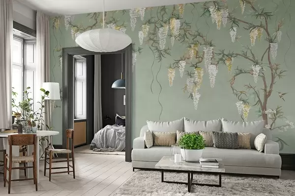 Fototapet Blommande grenar med vita blommor och fåglar på grönt Nr. w05394