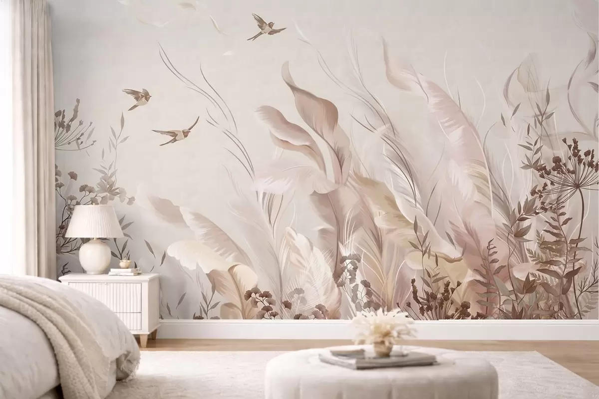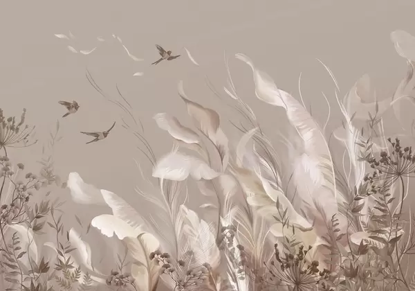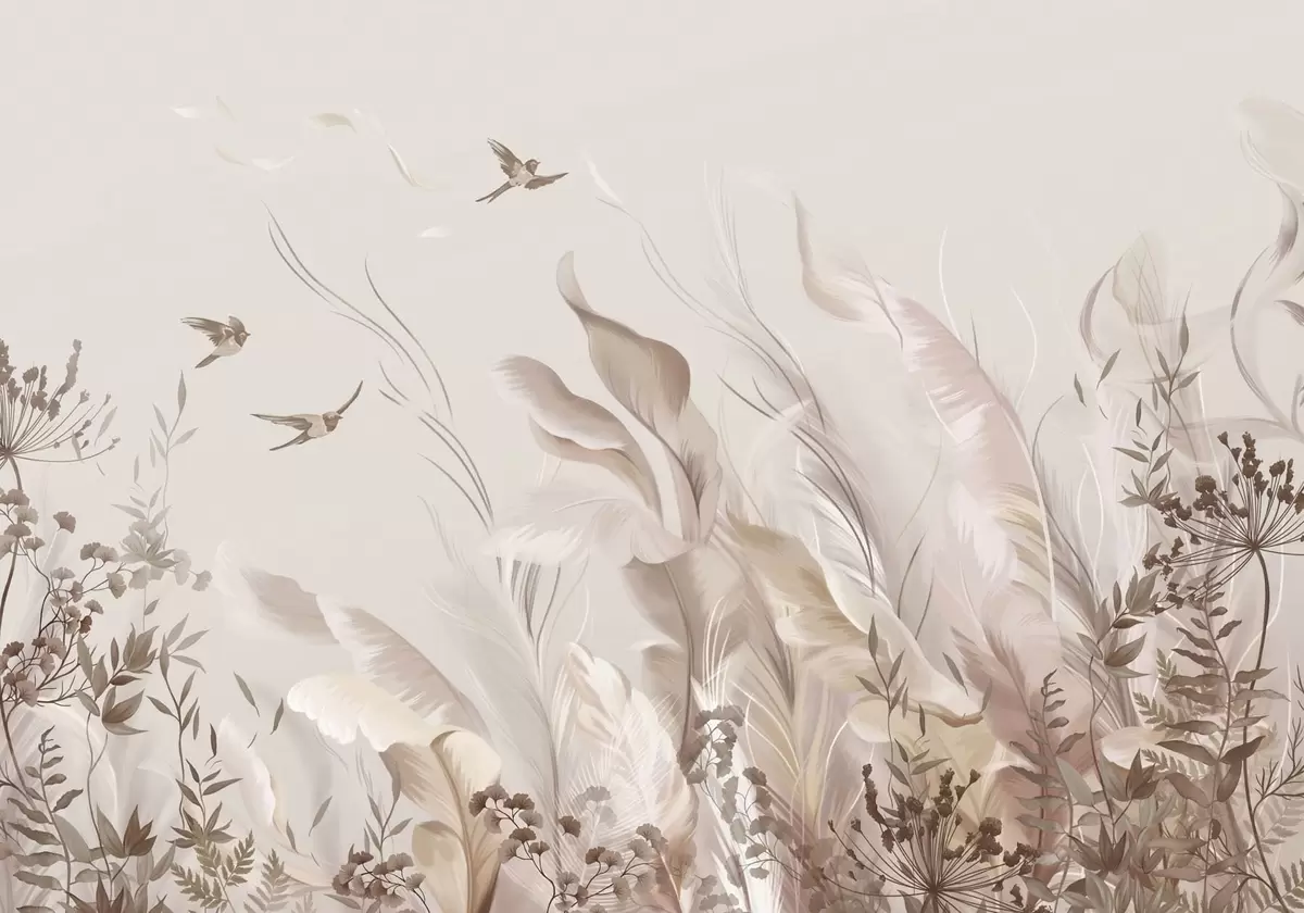 Fototapet Mjuka fjädrar, gräs och fåglar i ljusa nyanser Nr. w05395