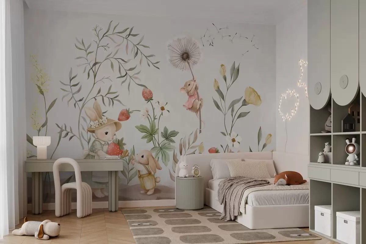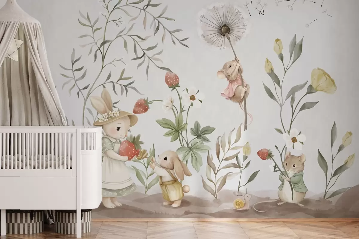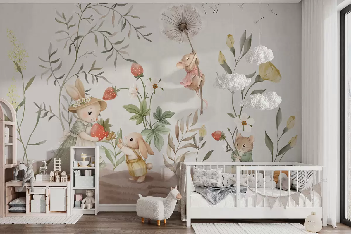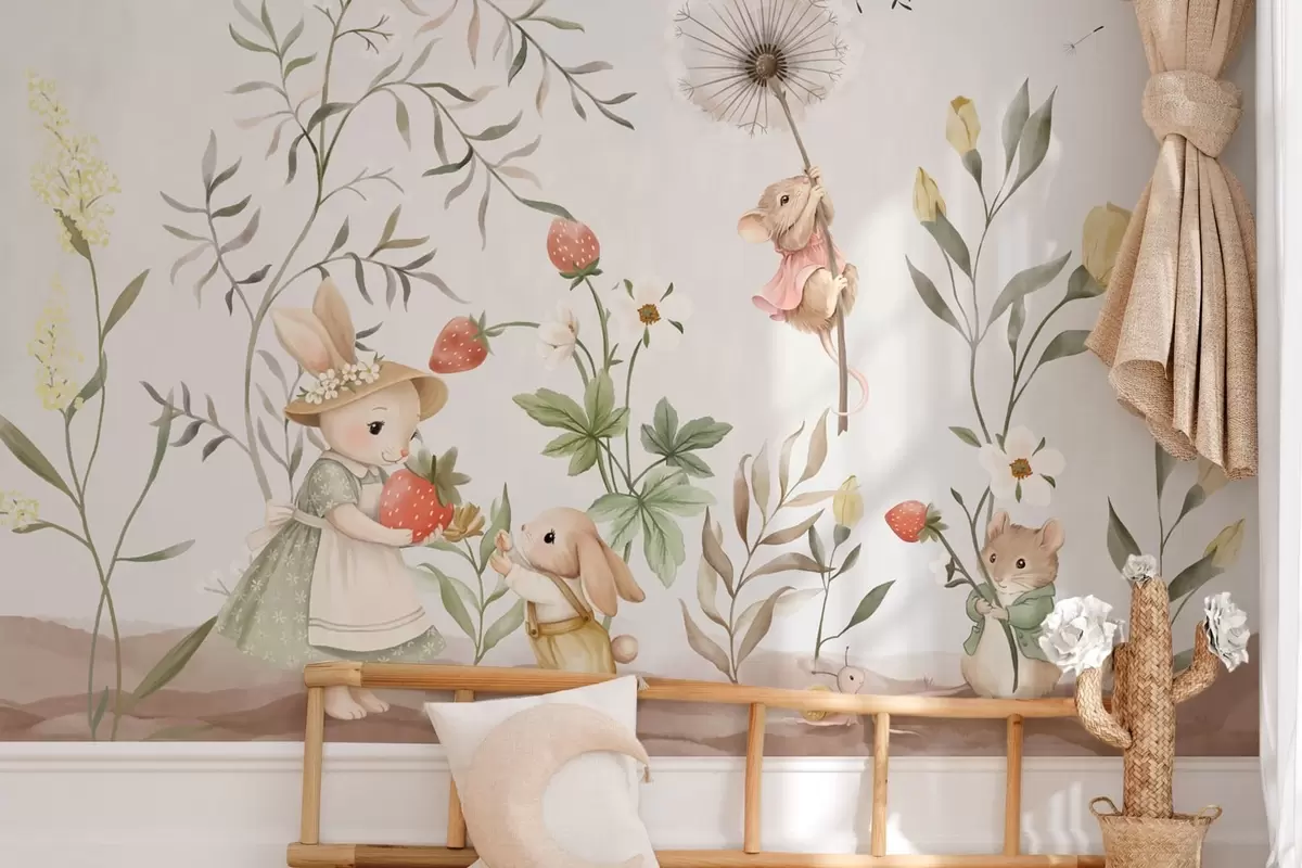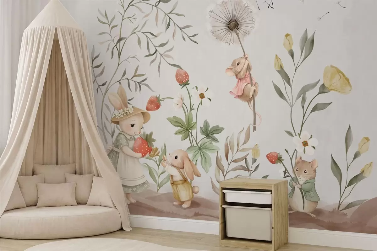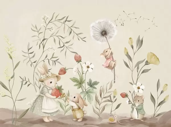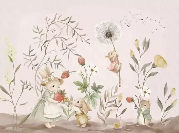 Fototapet Barnillustration av en kanin och en mus bland växter och blommor Nr. w05422