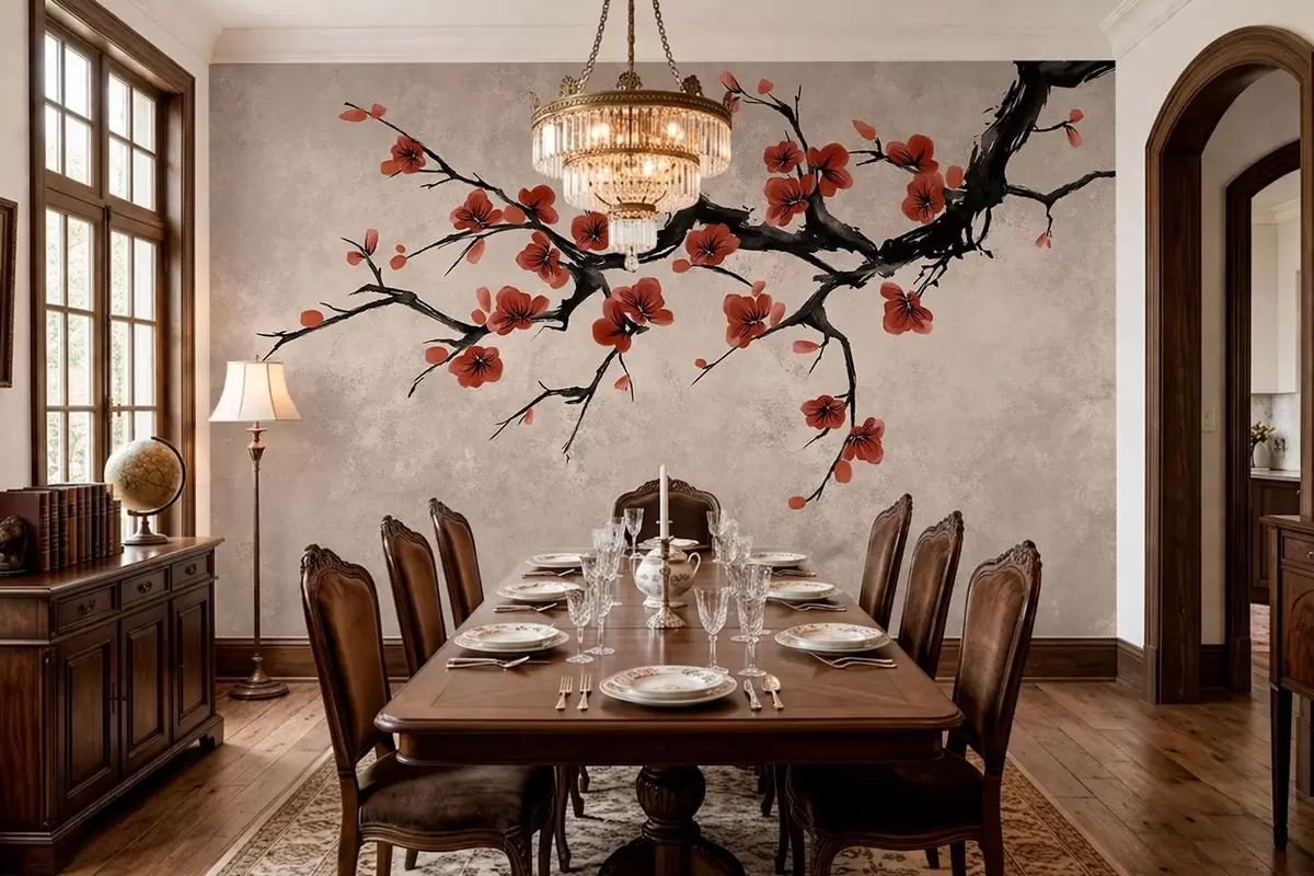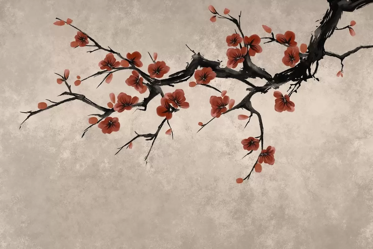 Fototapet En blommande gren i östlig stil på beige bakgrund Nr. w05425v4