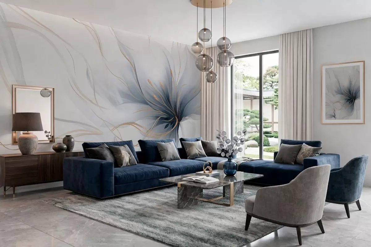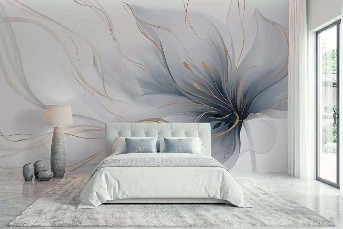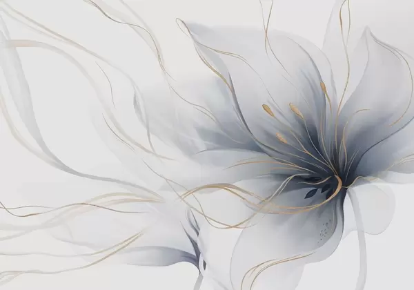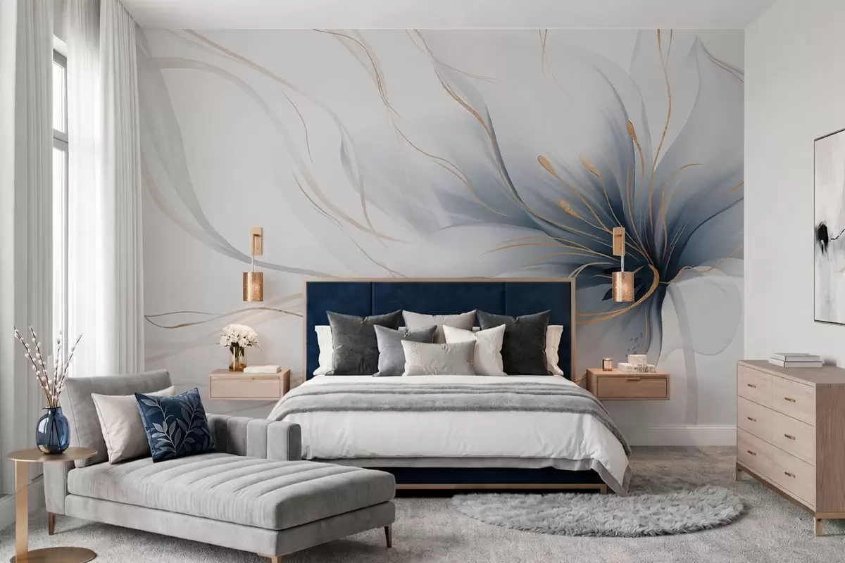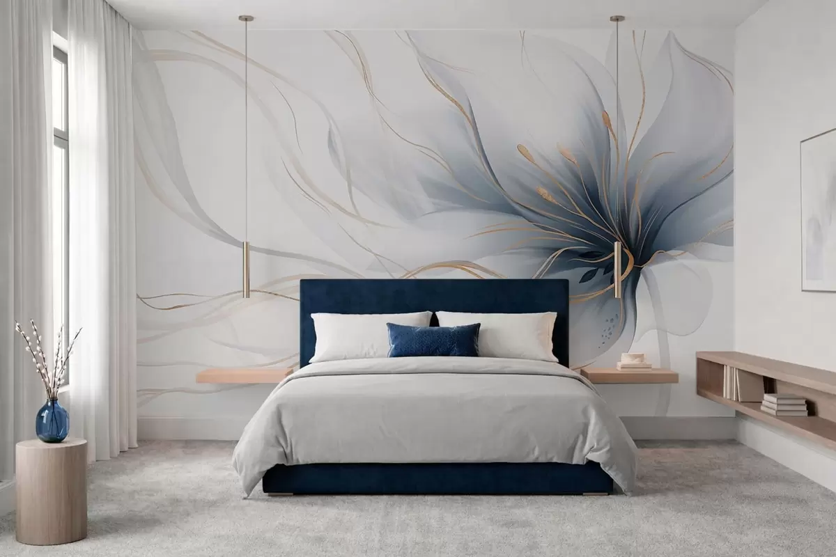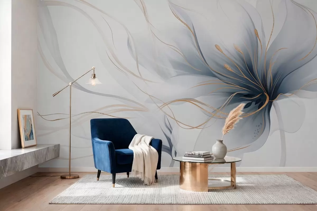Fototapet En abstrakt blå blomma med böljande linjer i Fluid Art-stil Nr. w05428