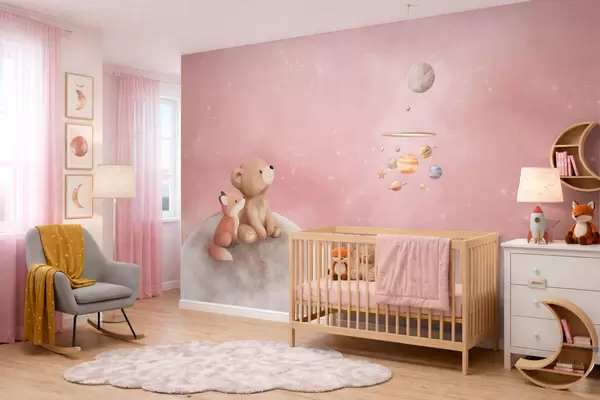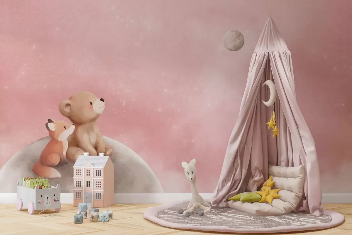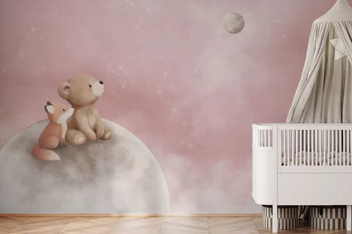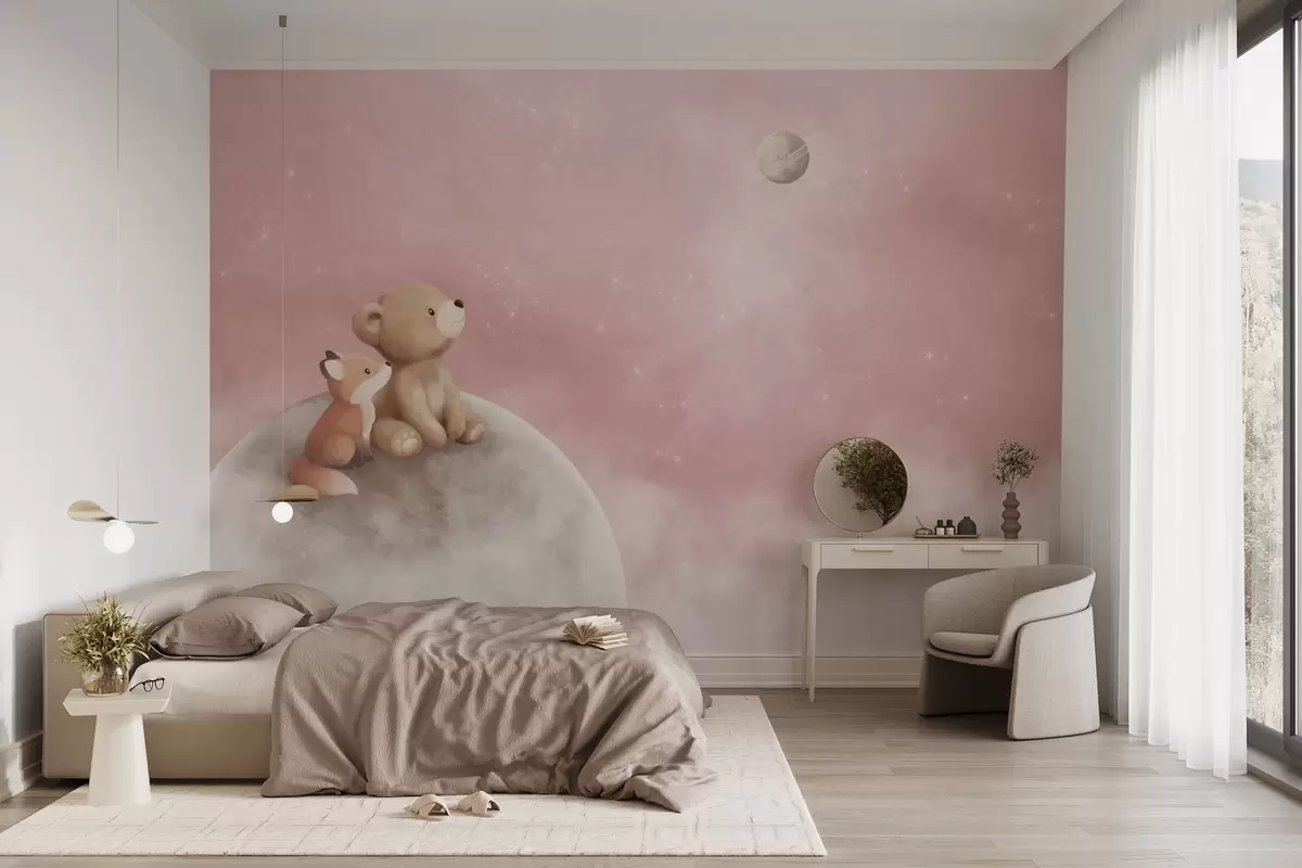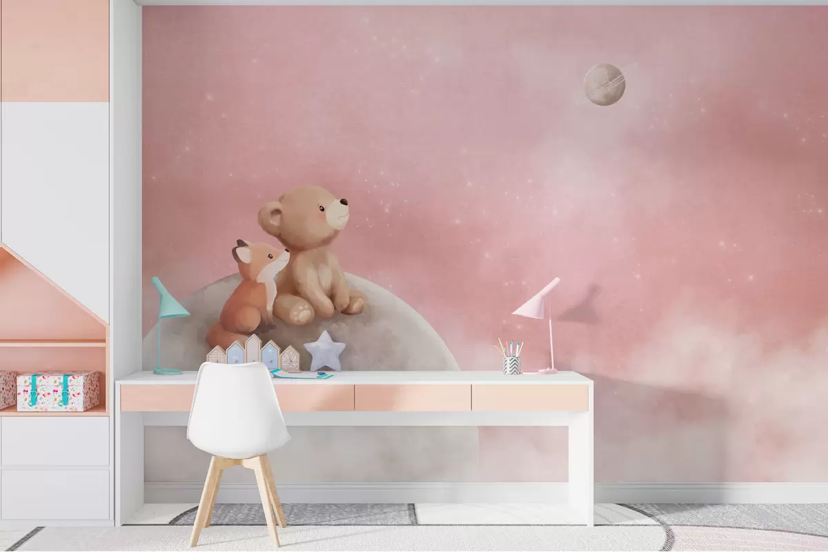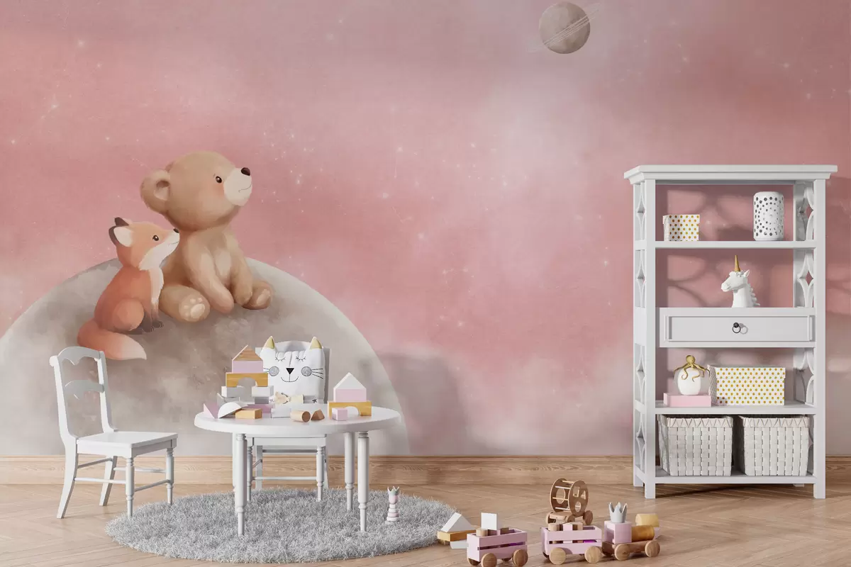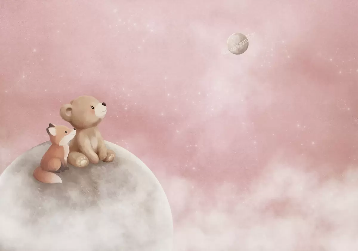 Fototapet Pastellillustration av en björn och en räv mot en rosa himmel med månen Nr. w05431v2