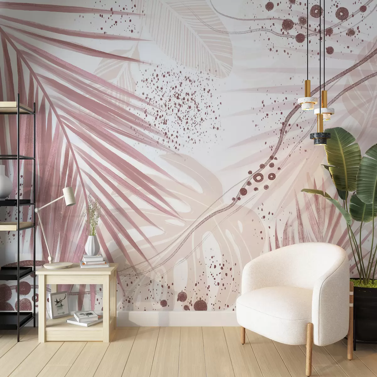 Fototapet En tropisk rosa palmblad och blad, med abstrakta former och stänk i nyanser av rosa och vitt Nr. w07918v1