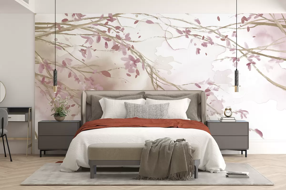 Fototapet Delikat rosa och vita blommiga grenar med mjuk, suddig akvarellbakgrund Nr. w07919v1