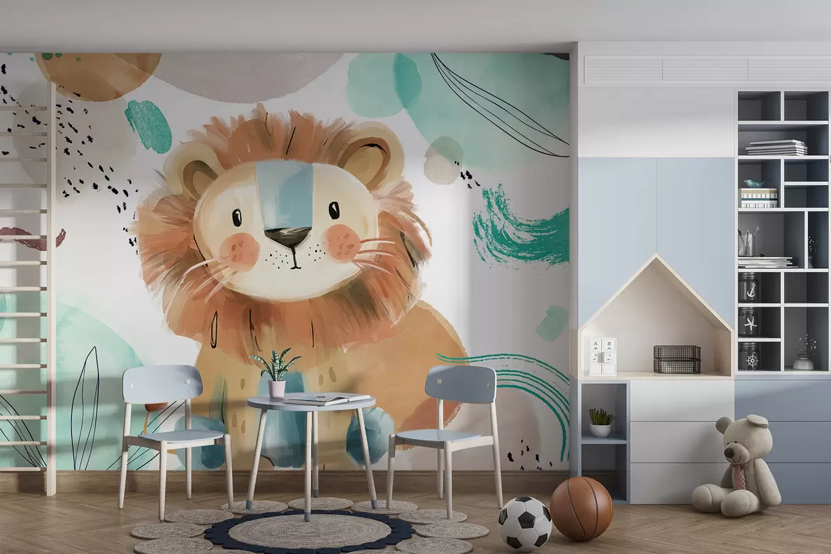 Fototapet Ett sött tecknat lejon i en färgglad, abstrakt bakgrund med penseldrag och stänk av pastellfärger Nr. w07924