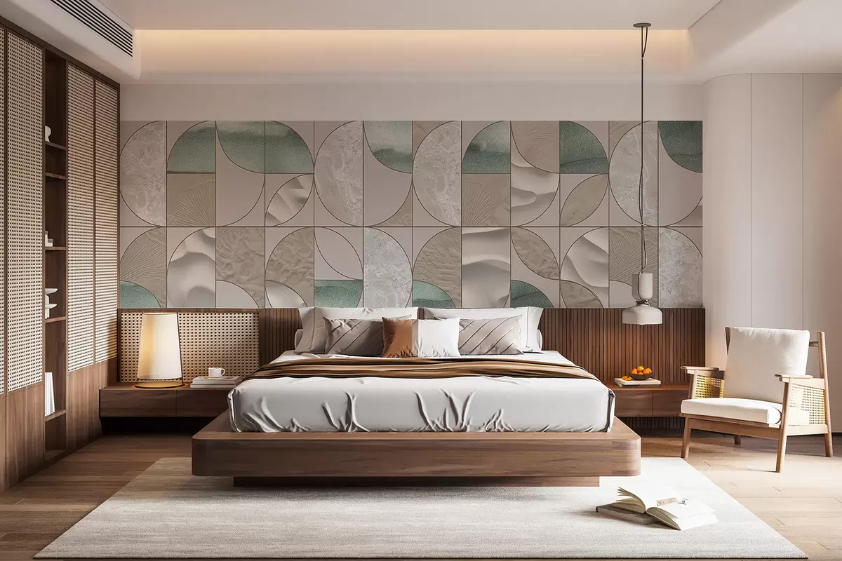 Fototapet Ett geometriskt mönster av gröna, beige och vita texturer arrangerade i en upprepande abstrakt design Nr. w07928