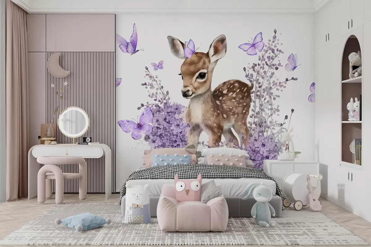 Fototapet En ung hjort med stora ögon och prickig päls omgiven av lila blommor och fjärilar Nr. w07931