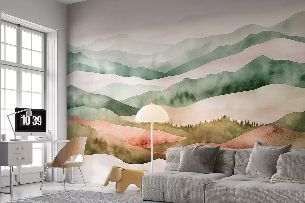 Fototapet Akvarell berg landskap, skog, natur, gröna och beige färger Nr. w07950v1