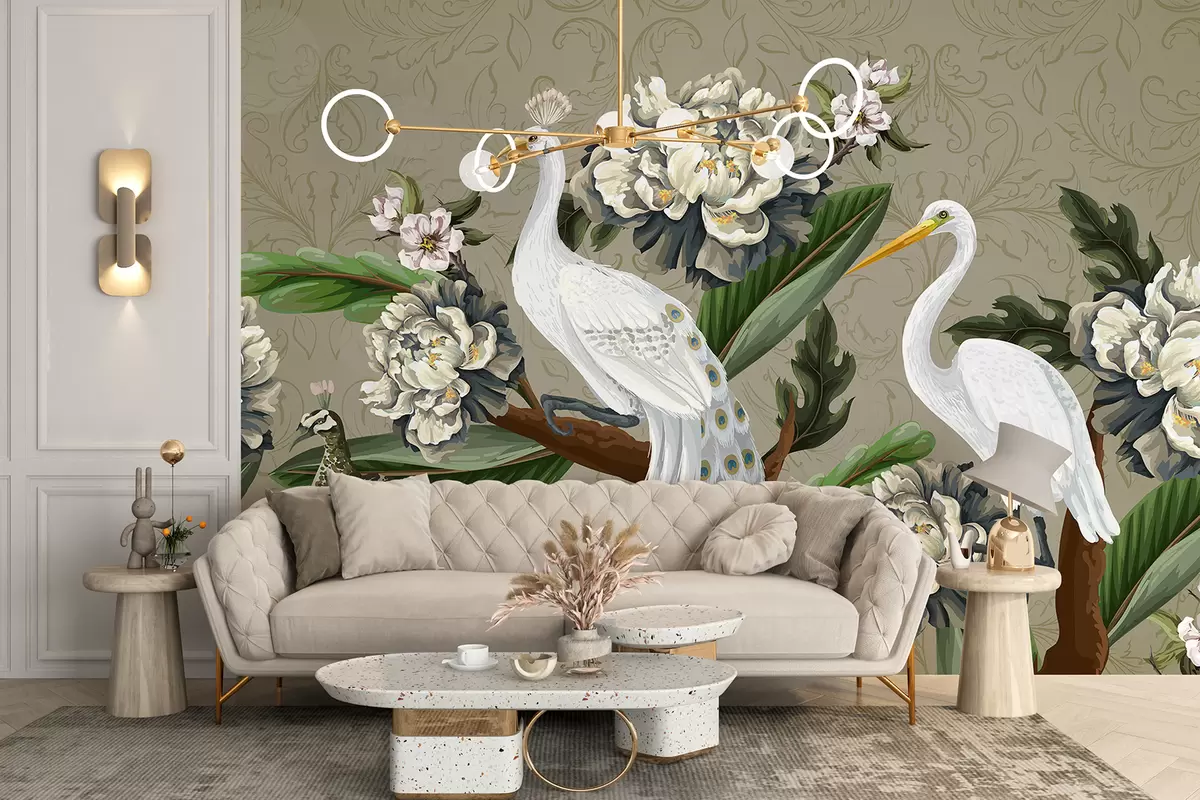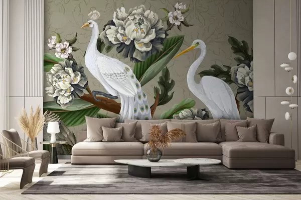 Fototapet Ett par vita påfåglar med långa svansar omgivna av stora vita pionblommor och frodigt grönt bladverk Nr. w07975