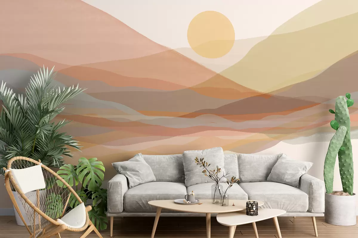 Fototapet Bergigt landskap med en varm sol på himlen, böljande kullar i nyanser av orange, gult och brunt Nr. w07976