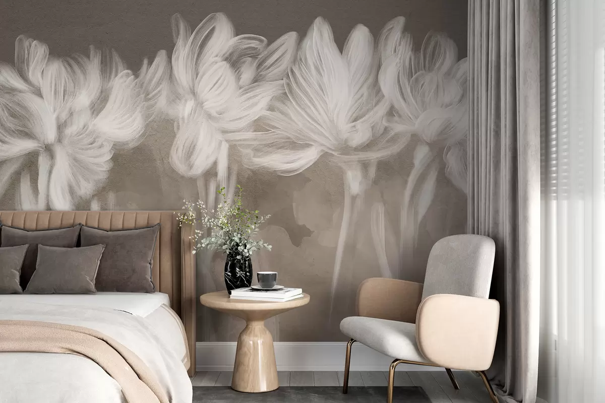 Fototapet Mjuk minimalism vita genomskinliga blommiga silhuetter på brun texturerad bakgrund Nr. w07986