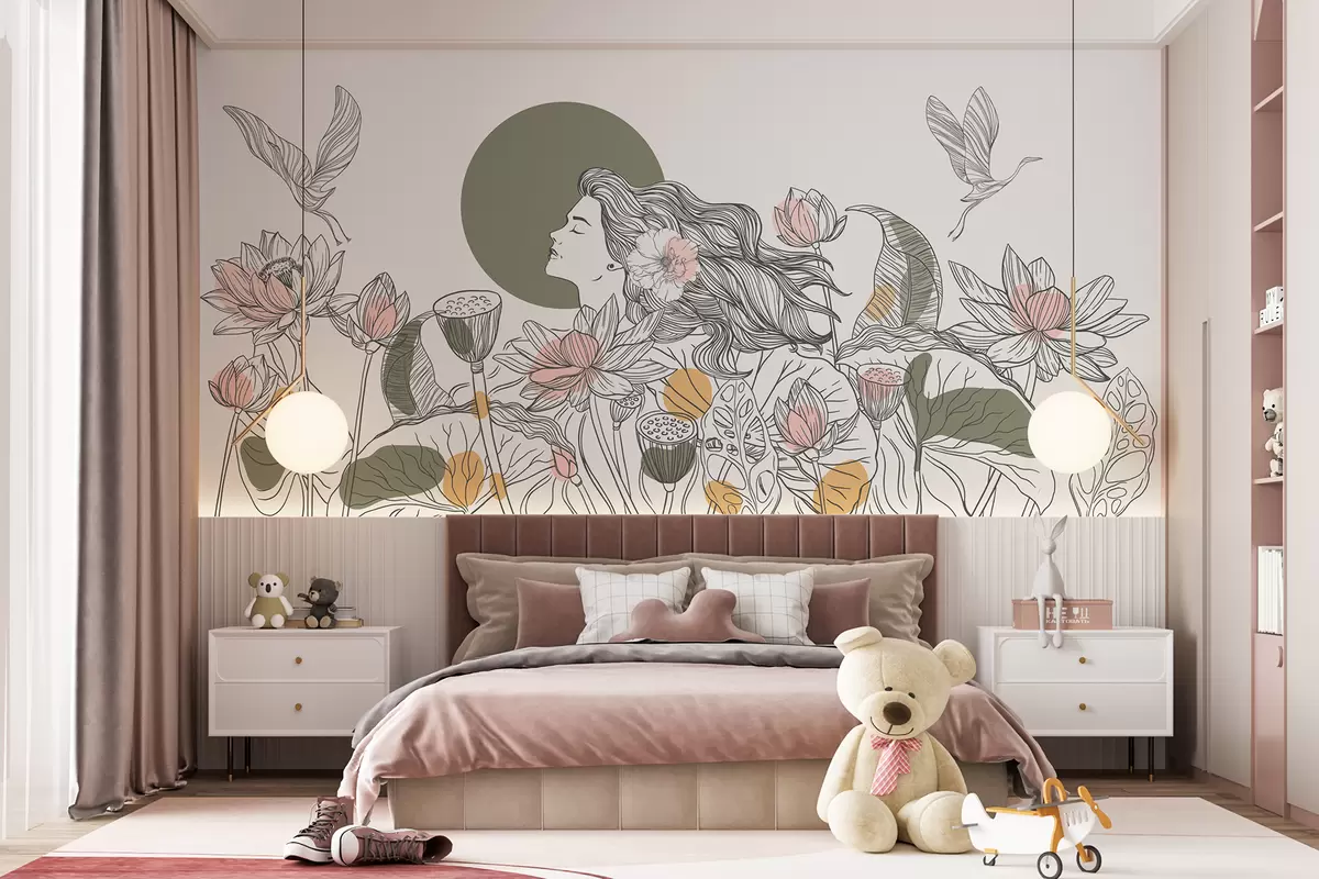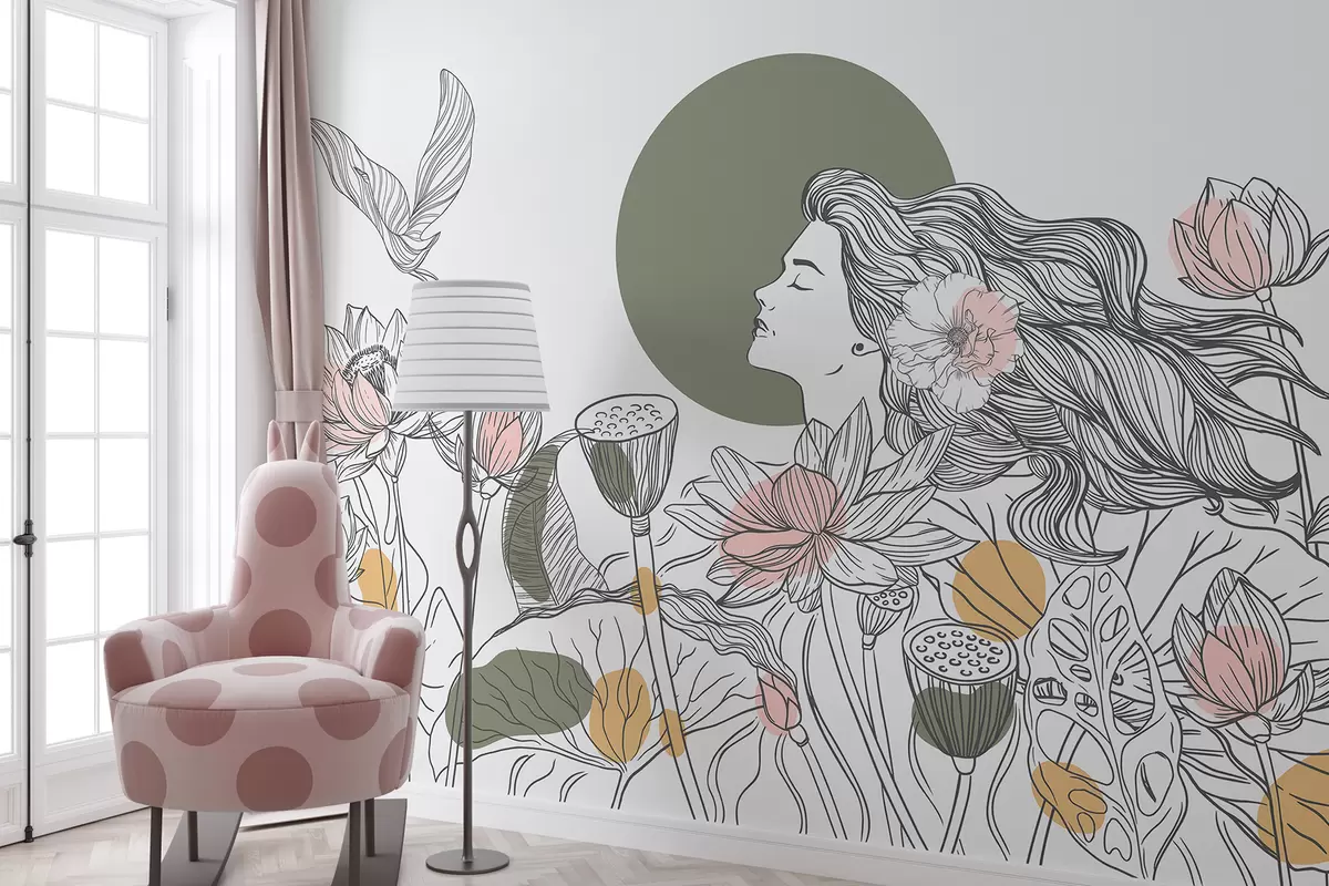 Fototapet Kvinna i naturen, linjeteckning, lotusblommor, stora löv, flygande fåglar, pastellfärger Nr. w07988v6