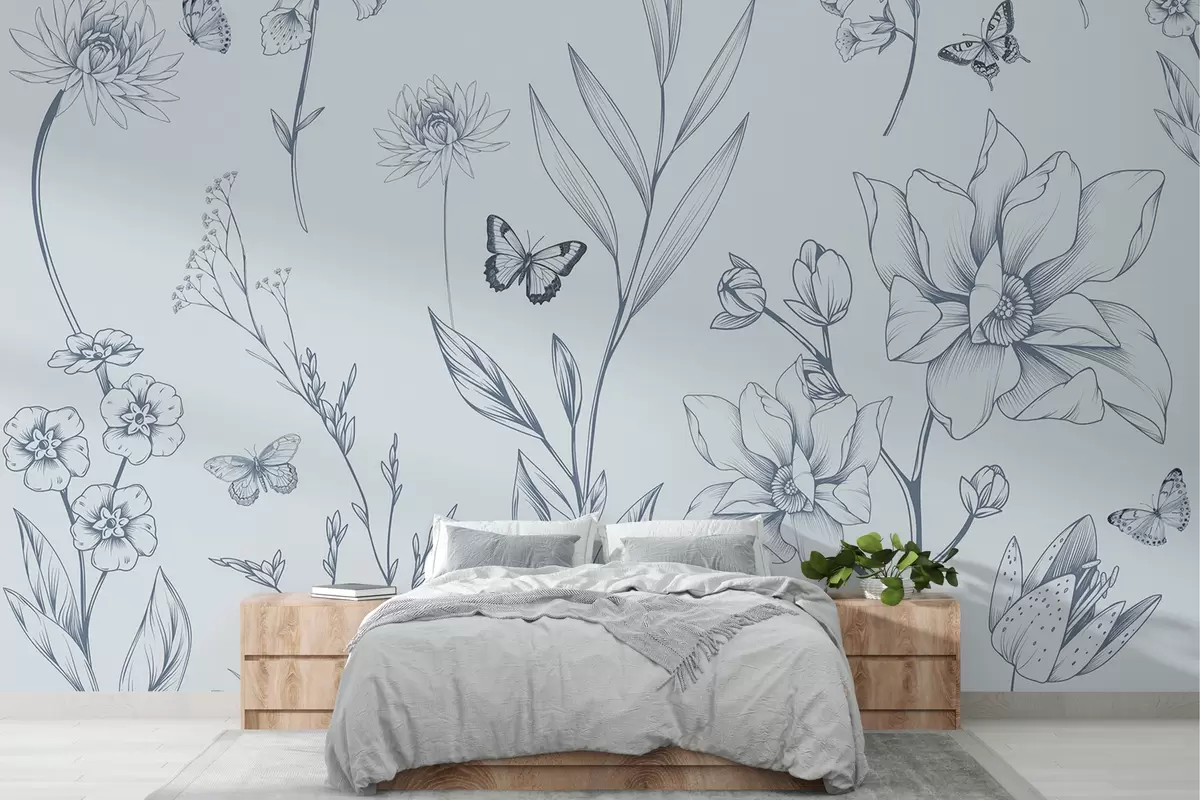 Fototapet Boho Monokroma blommor och fjärilar i blått Nr. w08088v2