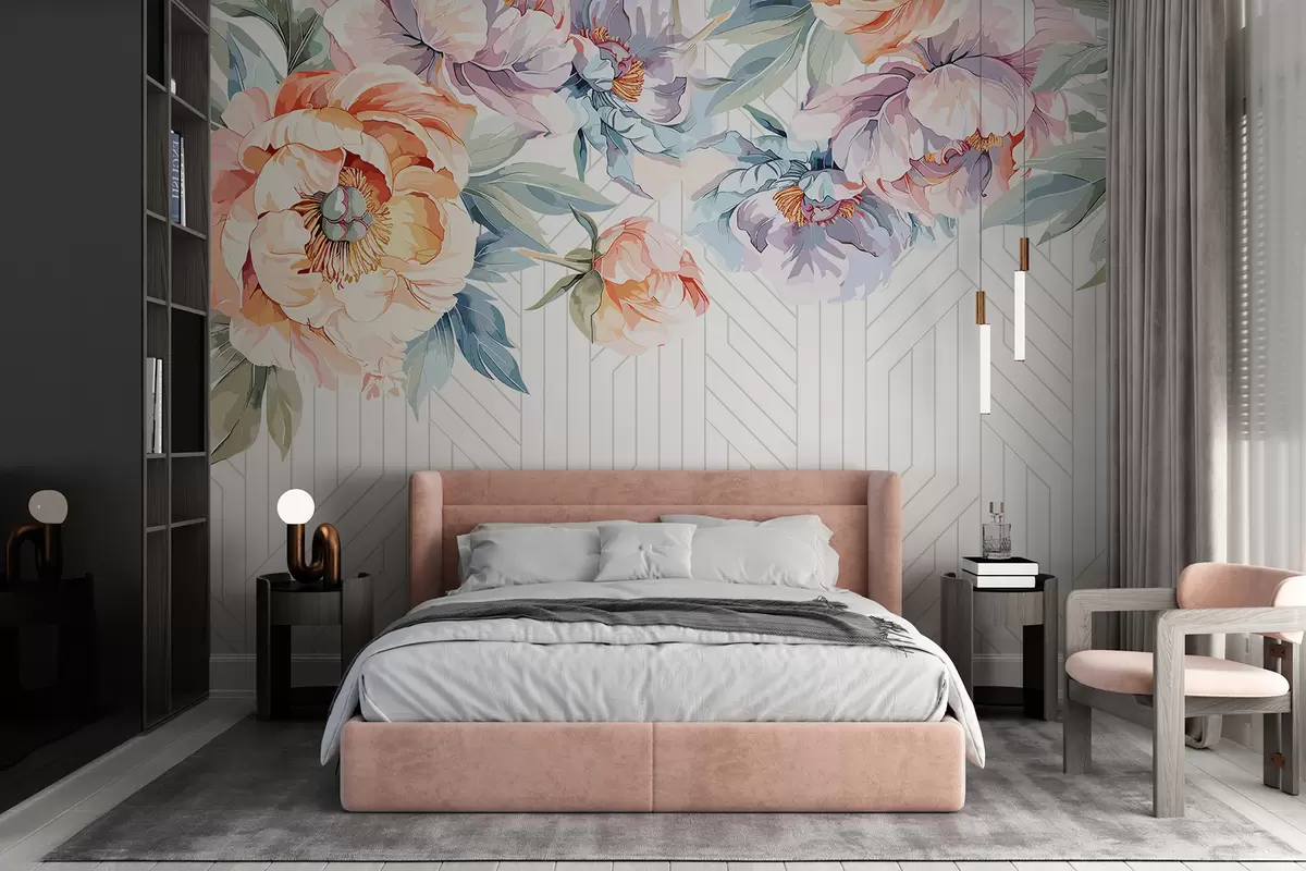 Fototapet Levande persika och rosa abstrakta pioner med gröna blad mot en vit och grå bakgrund Nr. w08183