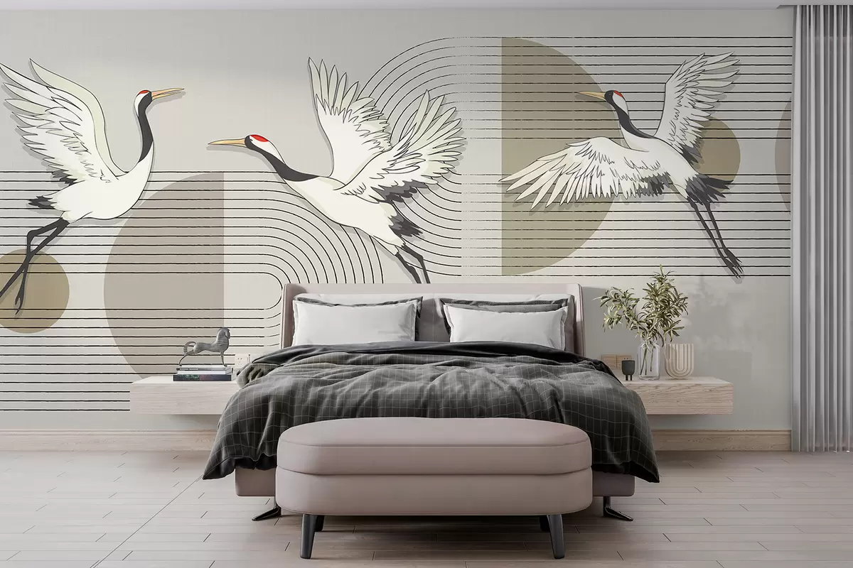Fototapet Tre vita kranar i flyg mot en geometrisk minimalistisk bakgrund med koncentriska cirklar Nr. w08188