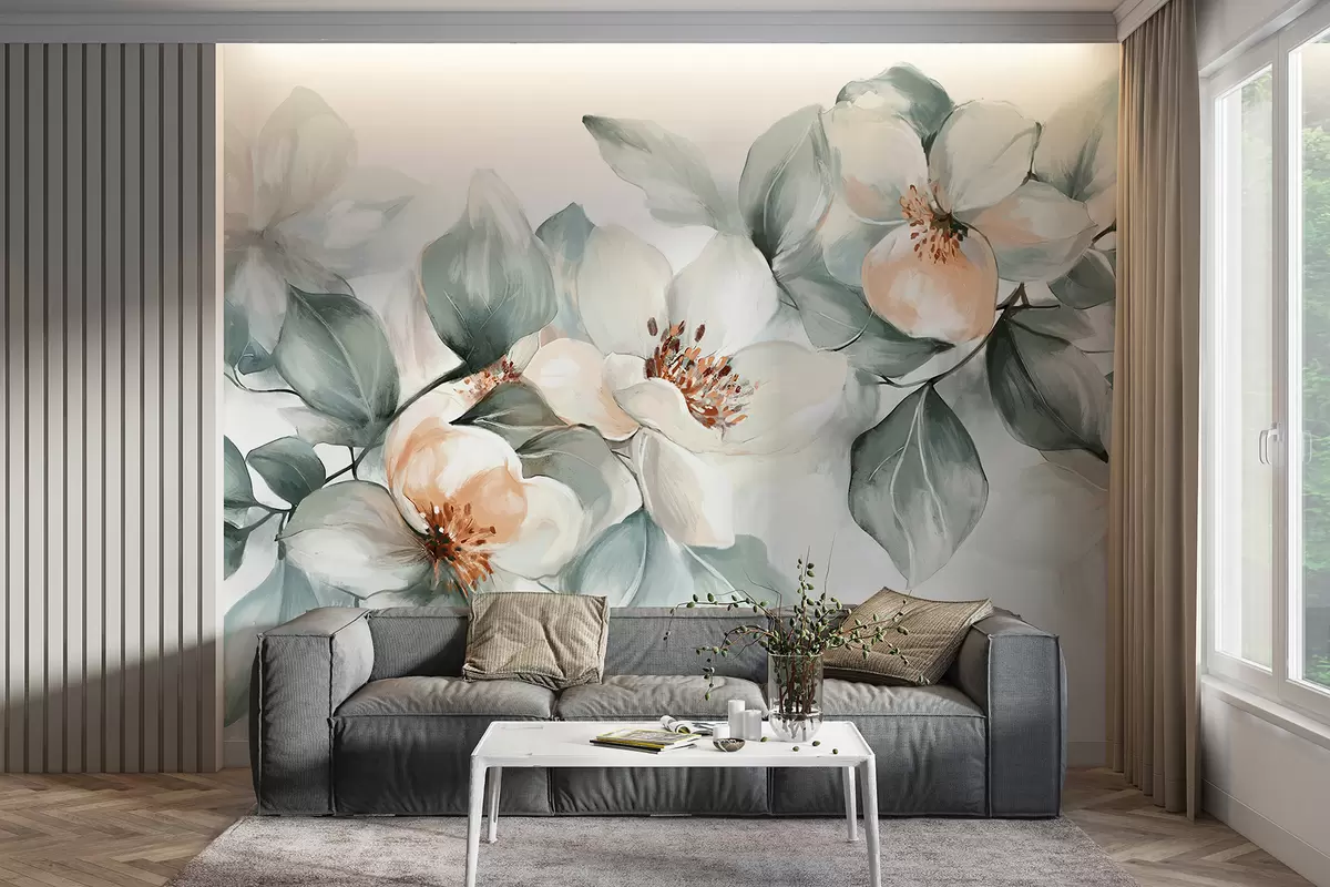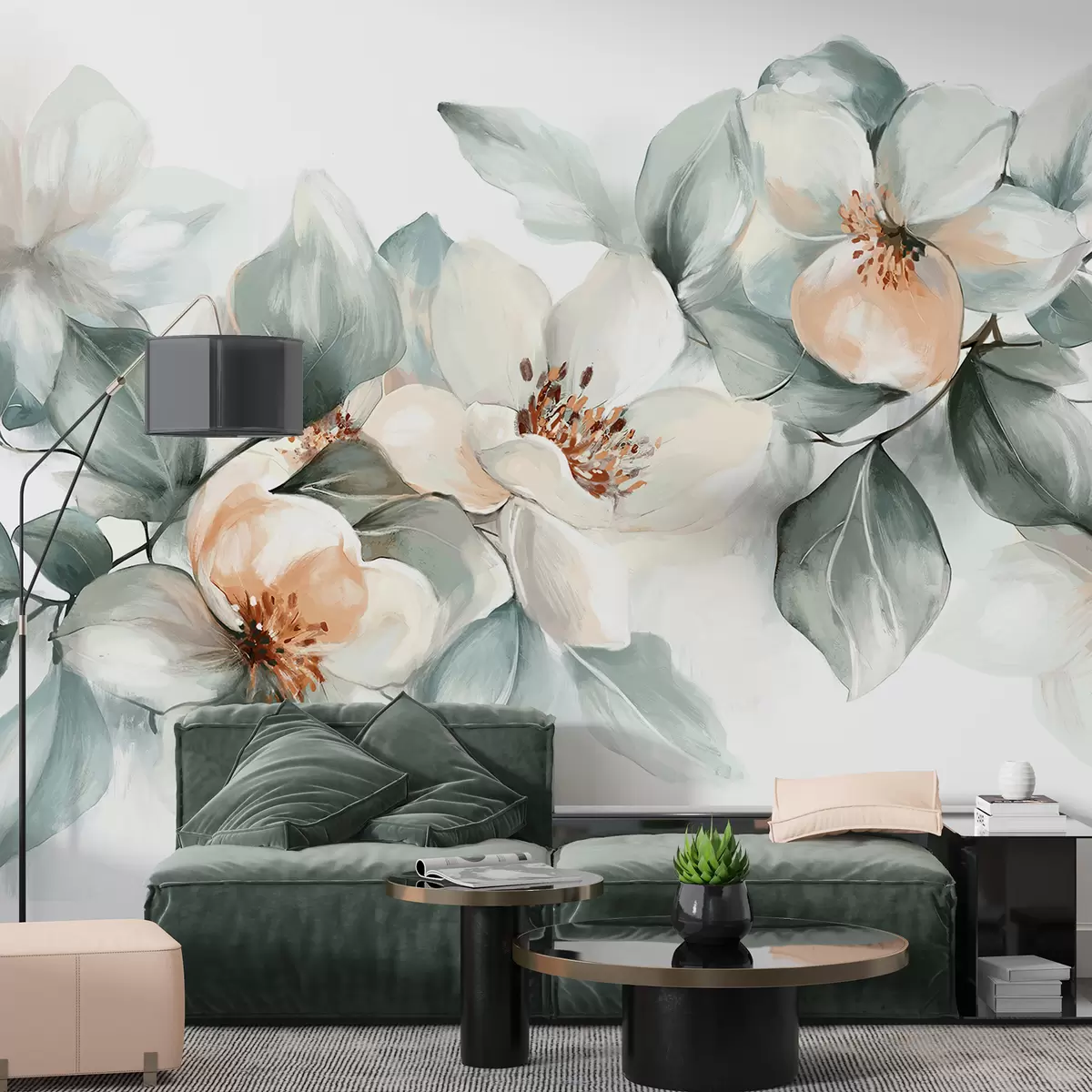 Fototapet Delikat vita och rosa magnoliablommor med mjuka gröna blad mot en ljus bakgrund Nr. w08220