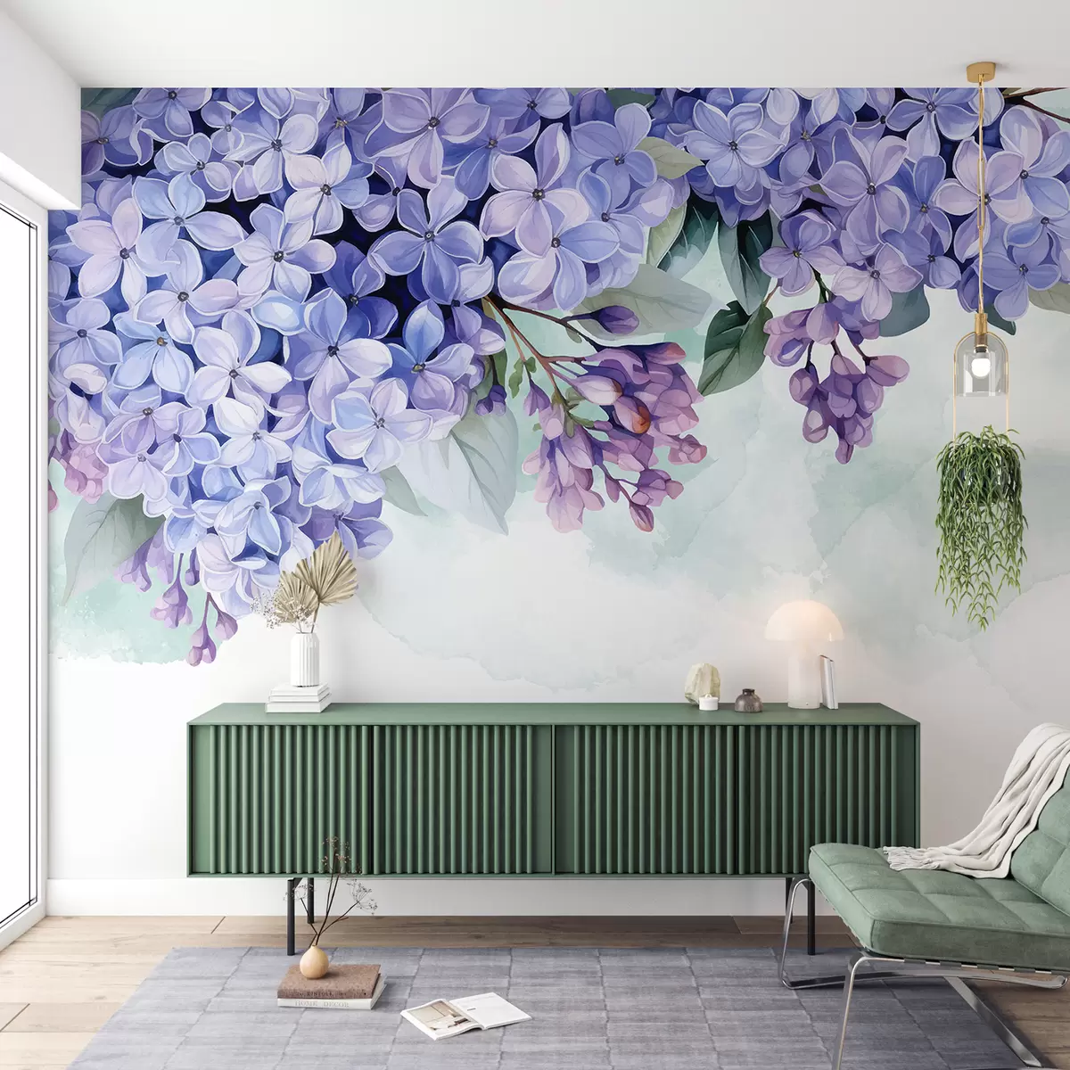 Fototapet Vibrerande lila hortensiablommor med gröna blad, fyller ramen mot en mjuk, suddig bakgrund Nr. w08223