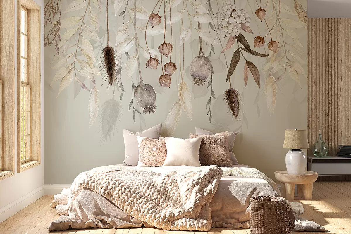 Fototapet Delikat blomsterarrangemang med torkade blommor, löv och fjädrar som hänger mot en mjuk bakgrund Nr. w08230