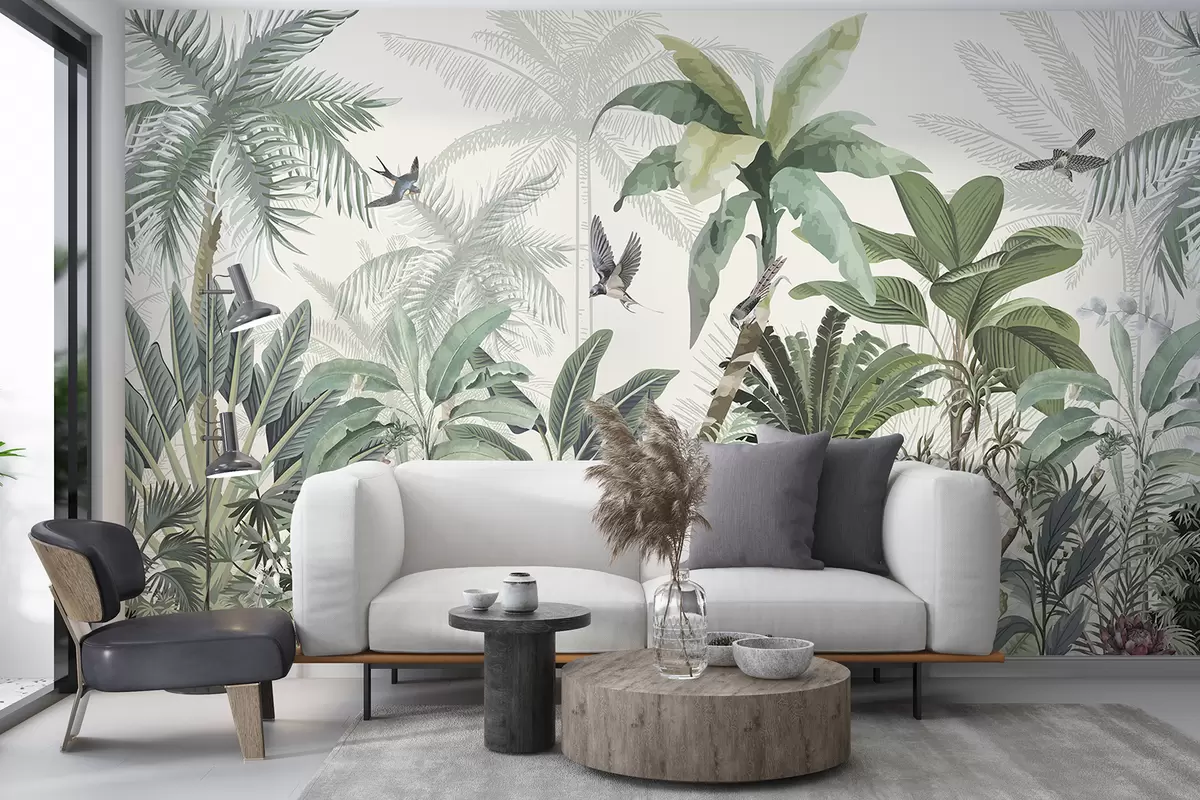 Fototapet En frodig tropisk djungelscen med olika palmer, stora löv och färgglada blommor i förgrunden w08239