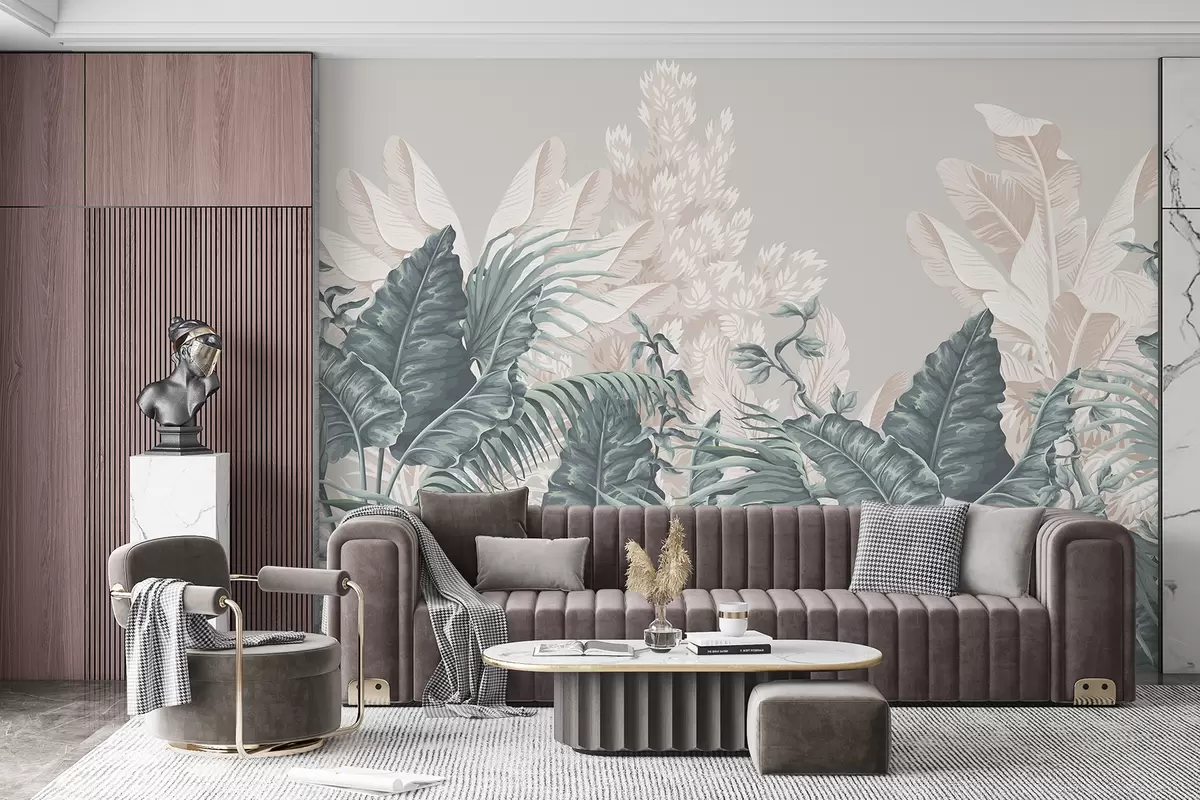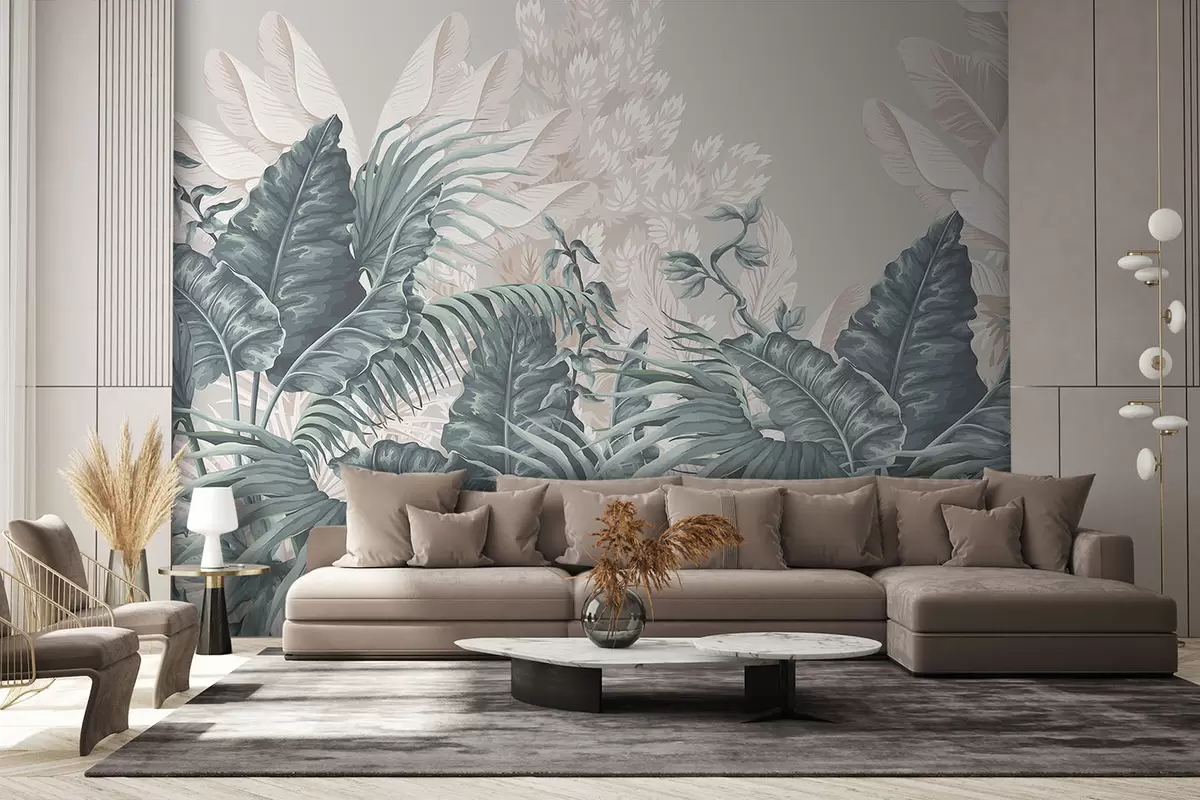 Fototapet En tropisk djungelscen med stora gröna löv och blommor i förgrunden som skapar en frodig atmosfär Nr. w08242