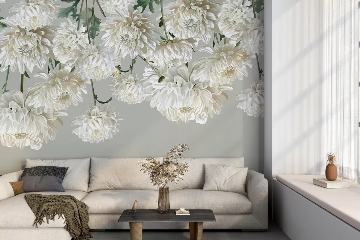 Fototapet Vita krysantemumblommor med gröna blad på en ljusgrå bakgrund Nr. w08251