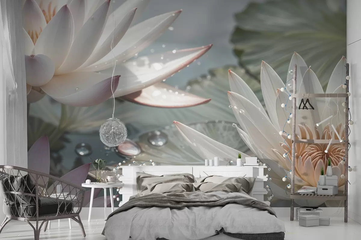 Fototapet En närbild av vita lotusblommor med vattendroppar på kronbladen mot en suddig grön bakgrund Nr. w08252