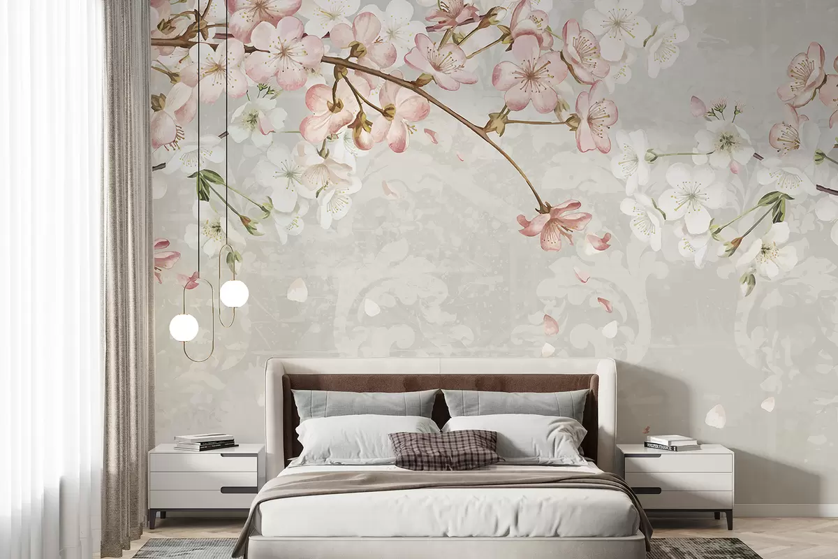 Fototapet Rosa och vita körsbärsblommor i full blom, med mjuka kronblad som faller mot en strukturerad beige bakgrund Nr. w08254v1