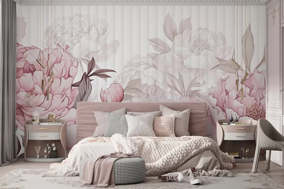 Fototapet En närbild av stora, skira rosa och vita pionblommor mot en mjuk, strukturerad bakgrund Nr. w08255