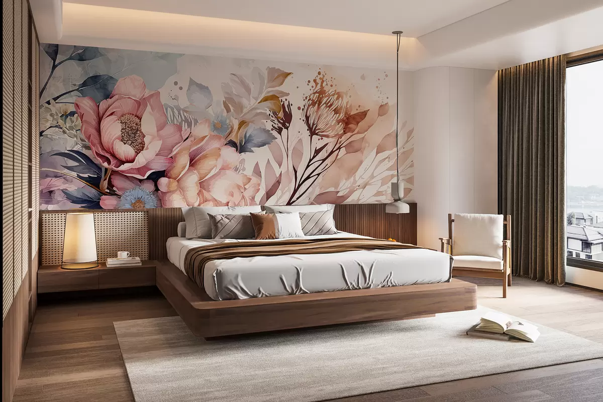 Fototapet Stora rosa och blå blommor med fina kronblad, omgivna av mindre blommor mot en akvarellbakgrund Nr. w08256