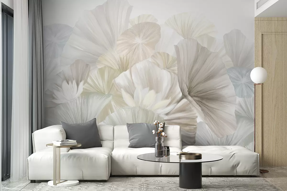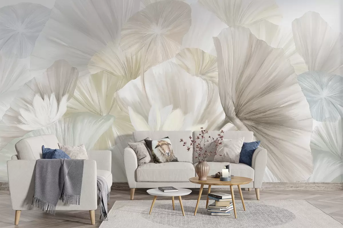 Fototapet Delikata gröna lotusblad med vita blommor med mjuka, fjäderliknande kronblad arrangerade i en naturlig konstkomposition Nr. w08265