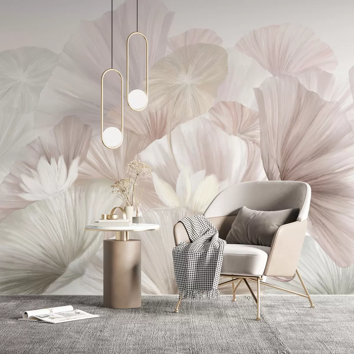 Fototapet Delikat rosa lotusblad med vita blommor med mjuka, fjäderliknande kronblad arrangerade i en naturlig konstkomposition Nr. w08265v1