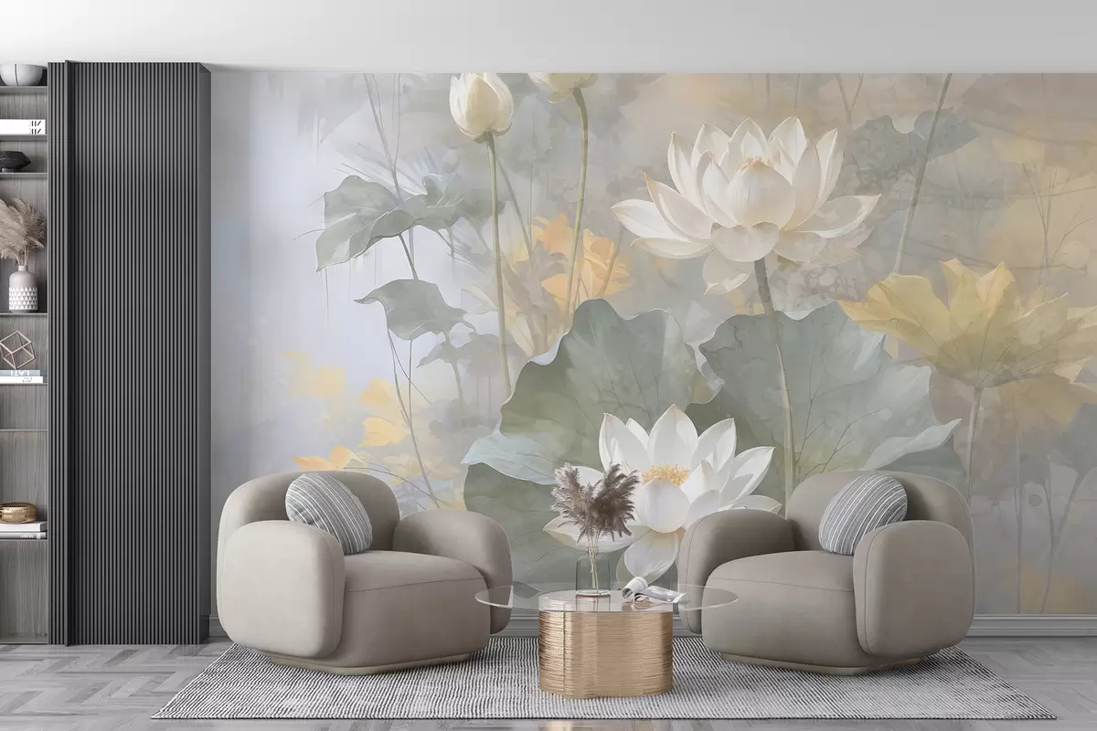 Fototapet Vita lotusblommor med blad i en damm med en mjuk, oskarp gul och grön bakgrund Nr. w08275