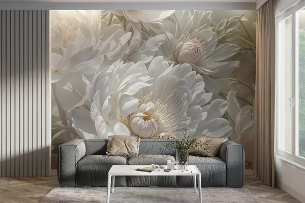 Fototapet En närbild av stora, fina vita pionblommor med mjuka, fluffiga kronblad och ljusgul mitt Nr. w08325
