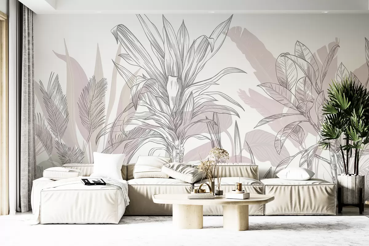Fototapet En tropisk grafisk växt med stora, frodiga blad och blommor i nyanser av grått och vitt med rosa silhuetter av blommor Nr. w08327v1