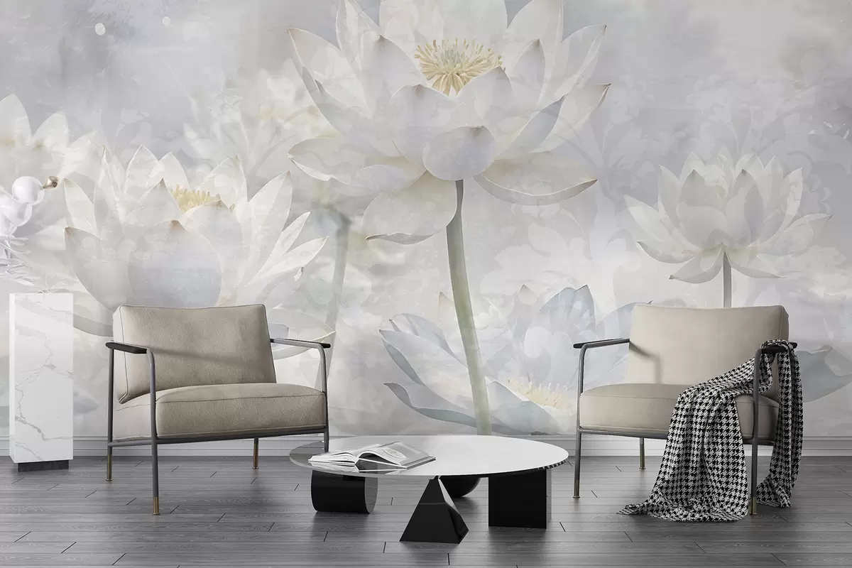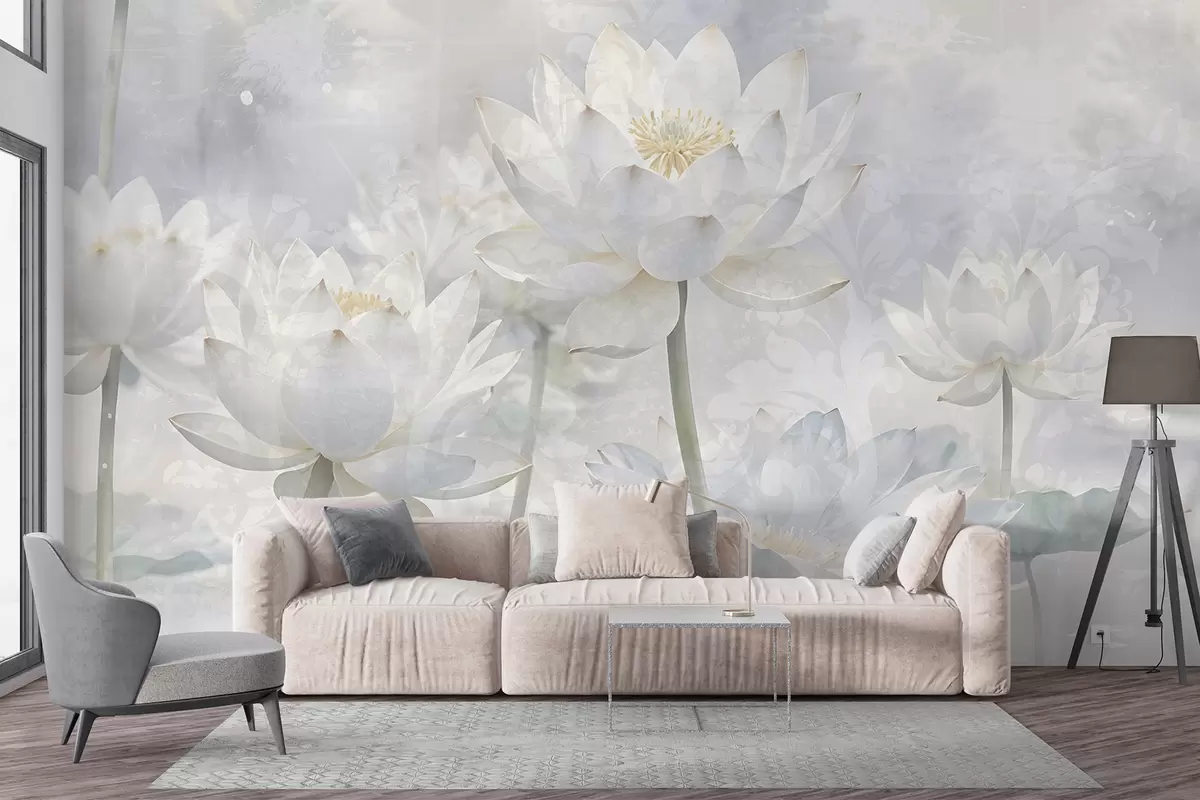Fototapet Vita lotusblommor i en dimmig, eterisk, abstrakt pastellfärgad landskapsbakgrund Nr. w08328