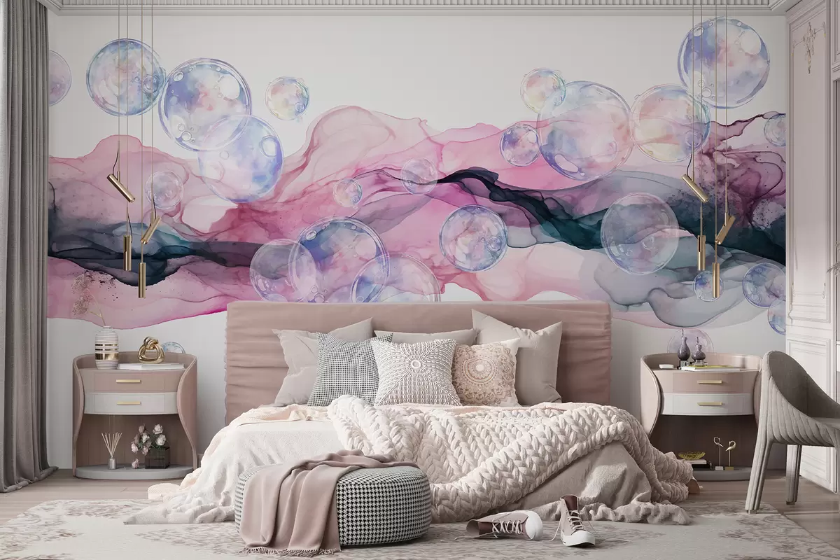 Fototapet Färgglada abstrakta flytande former med bubblor, virvlar i rosa, blå och lila nyanser mot en vit bakgrund w08337