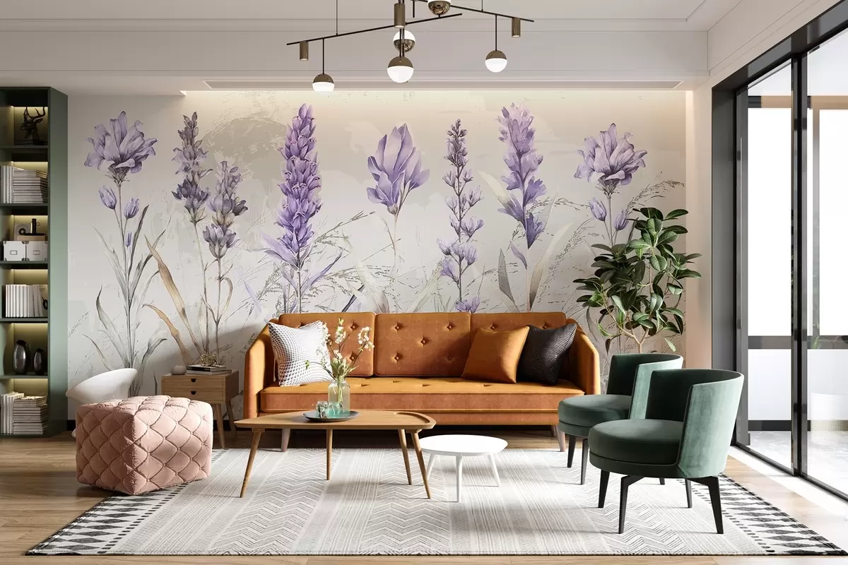 Fototapet Ett fält med lila vattenfärgslavendelblommor med mjuk, suddig texturerad beige bakgrund Nr. w08346