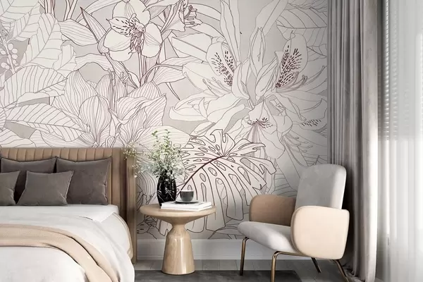 Fototapet Detaljerat blomstertryck i bordo och grått med olika typer av blommor och blad, en frodig, intrikat botanisk design w08385